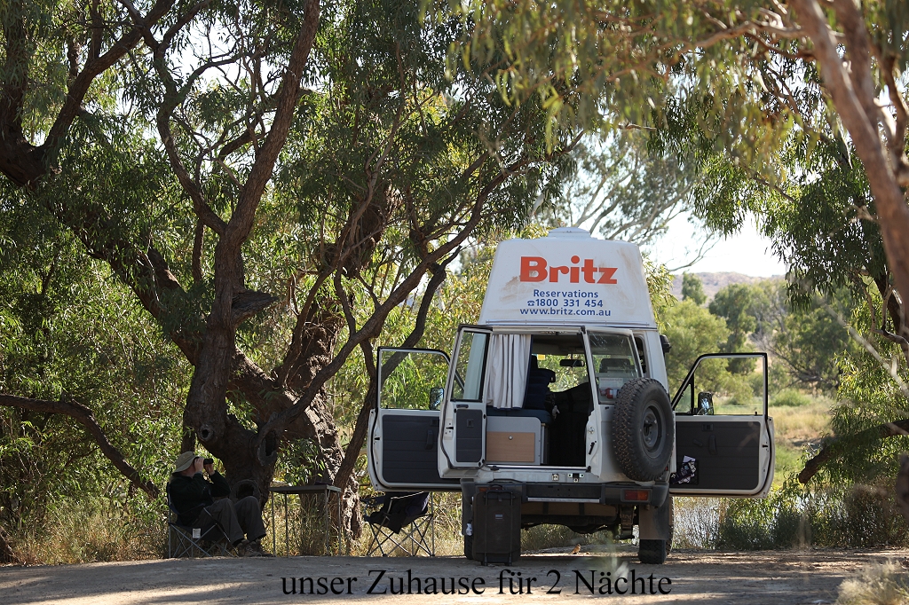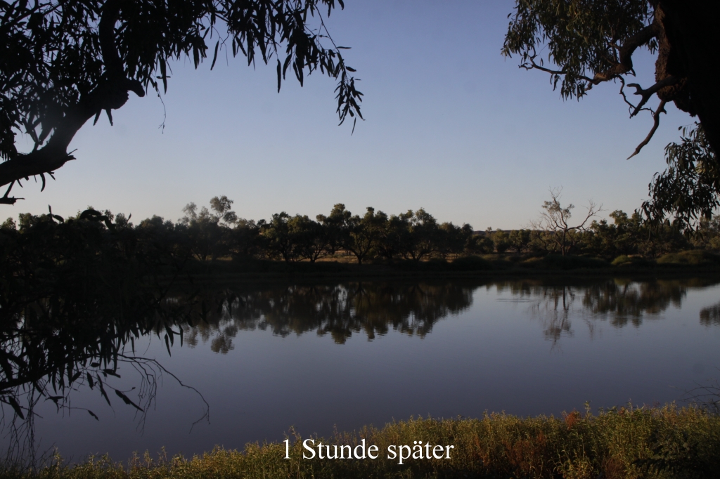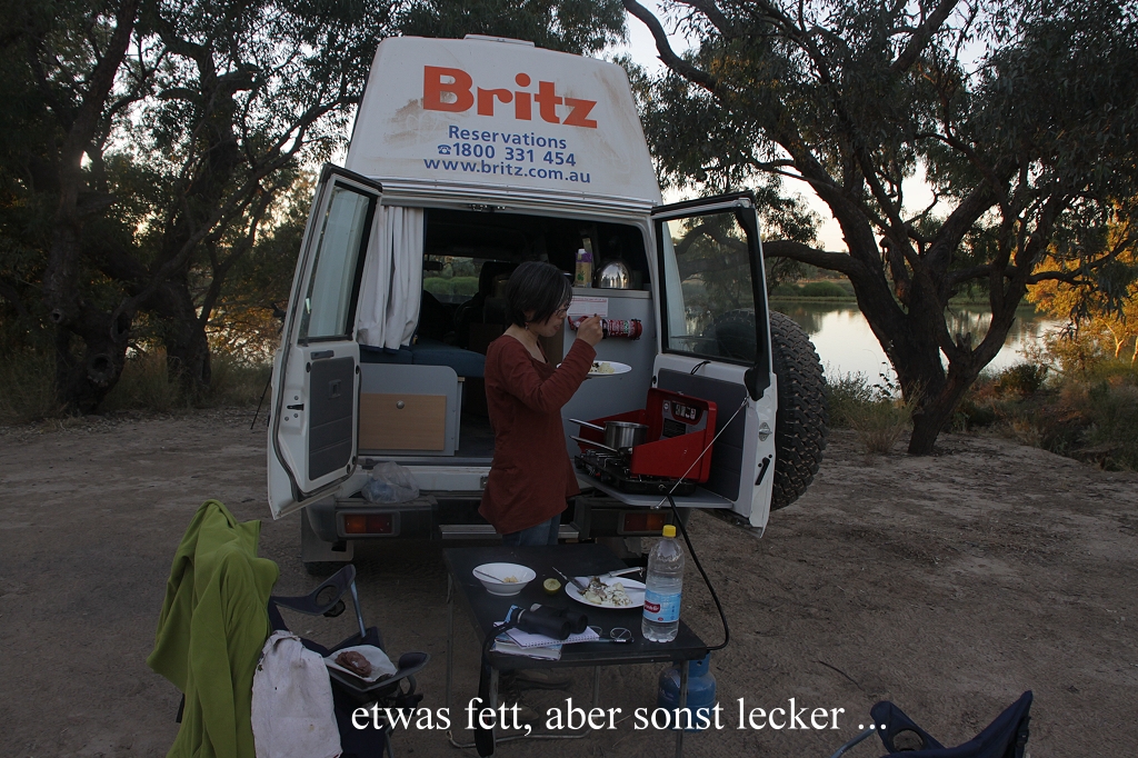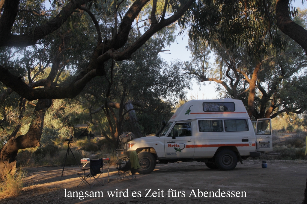 Gestern hatten wir ja einen Dingo gesehen und soeben hatten wir aus gar nicht so weiter Entfernung ein wolfsähnliches Geheul gehört, das sicher auch von einem Dingo stammte. Tomoko spülte das Geschirr und ich räumte die Dinge, die wir innen benötigten, ins Auto. Unsere beiden Koffer hatte ich wegen Platzmangels auf der Motorhaube unseres Autos platziert, was Tomoko gar nicht gefiel. Ich versprach ihr, sobald später das Bett gemacht war, zumindest ihren Koffer nach innen zu holen. Nachdem die Fliegenplage aufgehört hatte, tauchte eine neue Belästigung auf, Moskitos. Ich trank meinen Tee noch draußen, während Tomoko sich schon ins Wageninnere zurückzog. Ich kam aber auch nach einer Viertelstunde nach. Dort schrieb ich wieder mein Tagebuch und Tomoko sichtete unsere gemachten Fotos. Die Temperatur im Auto war noch angenehm, 22°. Mal sehen, wie weit das Thermometer während der Nacht nach unten sinkt… Nach den beiden Luxustagen im Hotel, freuten wir uns wieder auf die gewohnte Umgebung mit unseren Schlafsäcken in der freien Natur. Der Tagesablauf hatte uns so gut gefallen, dass wir eventuell noch eine weitere Nacht hierbleiben werden, mal sehen…Außerdem war Tomokos Aquarell noch nicht fertig und dank des geschenkten Fisches heute, waren auch unsere Lebensmittelvorräte noch nicht aufgebraucht. Trotzdem machte die frische Luft früh müde. Somit blieben wir nicht mehr allzu lange auf, sondern krochen gegen 20.30 Uhr in unsere Schlafsäcke.