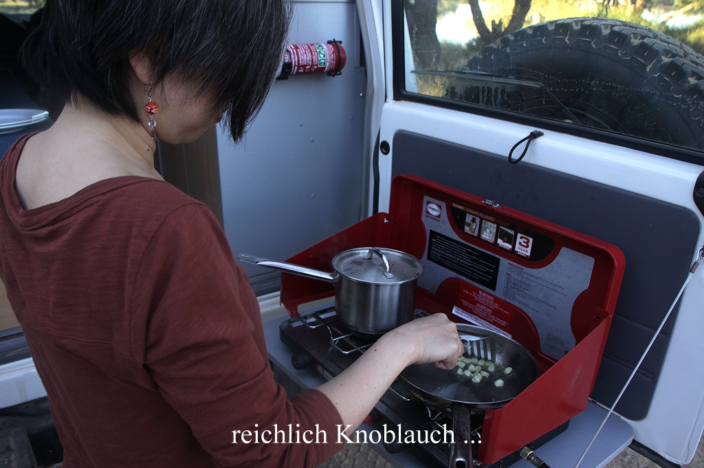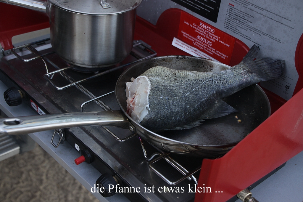 So gegen 16.30 Uhr erinnerten wir uns an den Fisch. Ich baute den Gasherd zusammen und Tomoko begann mit den Vorbereitungen, Kartoffeln schälen, Knoblauch schneiden, Kräuterbutter mischen… Der Fisch war ziemlich groß und passte kaum in unsere kleine Pfanne. Der Schwanz hing komplett über den Rand hinaus. Nach etwa 15 Minuten Bratzeit war der Fisch erst einen cm gar. Also kam Tomoko auf die gute Idee, das gare Fleisch schon abzukratzen und auf die Teller zu verteilen. Der Rest briet weiter. So verfuhren wir mit dem ganzen Fisch. Das Ergebnis war hervorragend. Der Fettgehalt war zwar ziemlich hoch, aber ich habe selten einen so schmackhaften Fisch gegessen, noch dazu in freier Natur. Die Salzkartoffeln passten sehr gut dazu, das einzige was ich mir noch gewünscht hätte, wäre ein schöner trockener Weißwein gewesen…