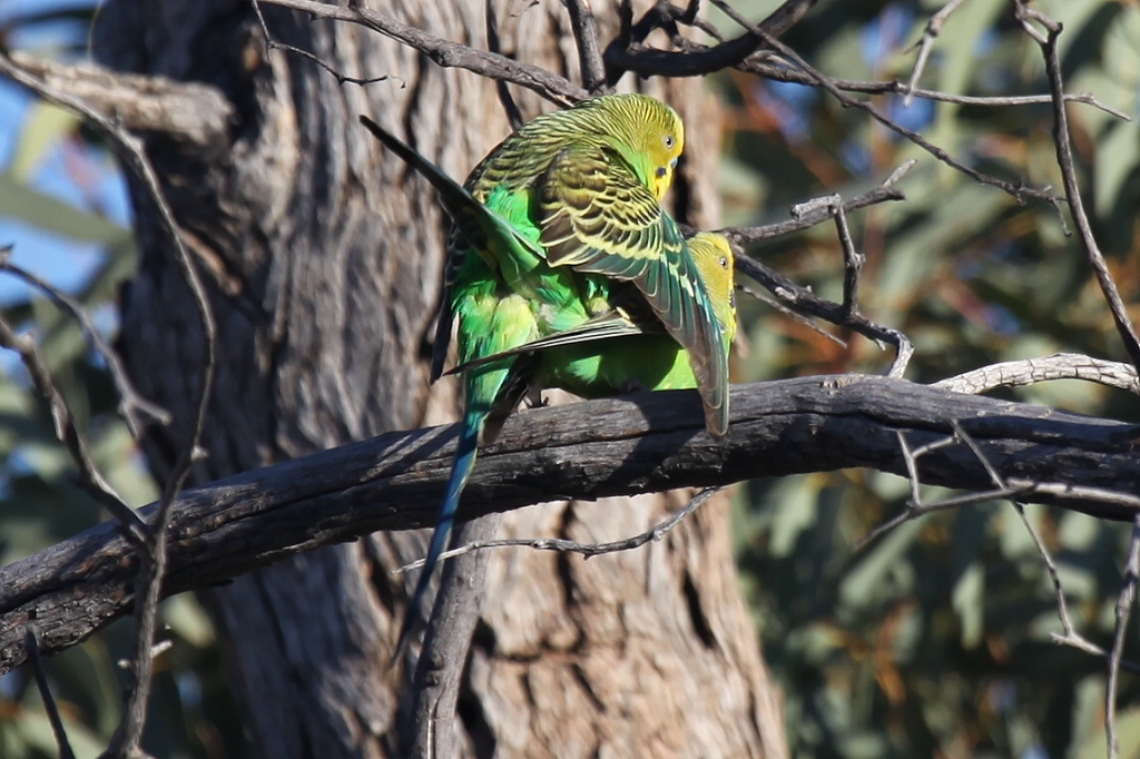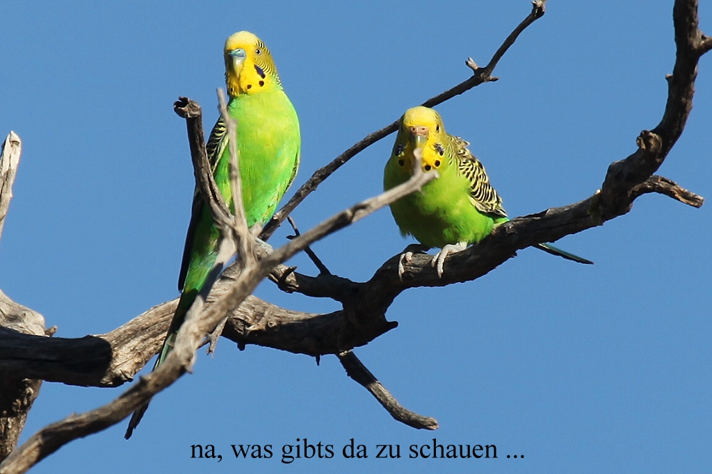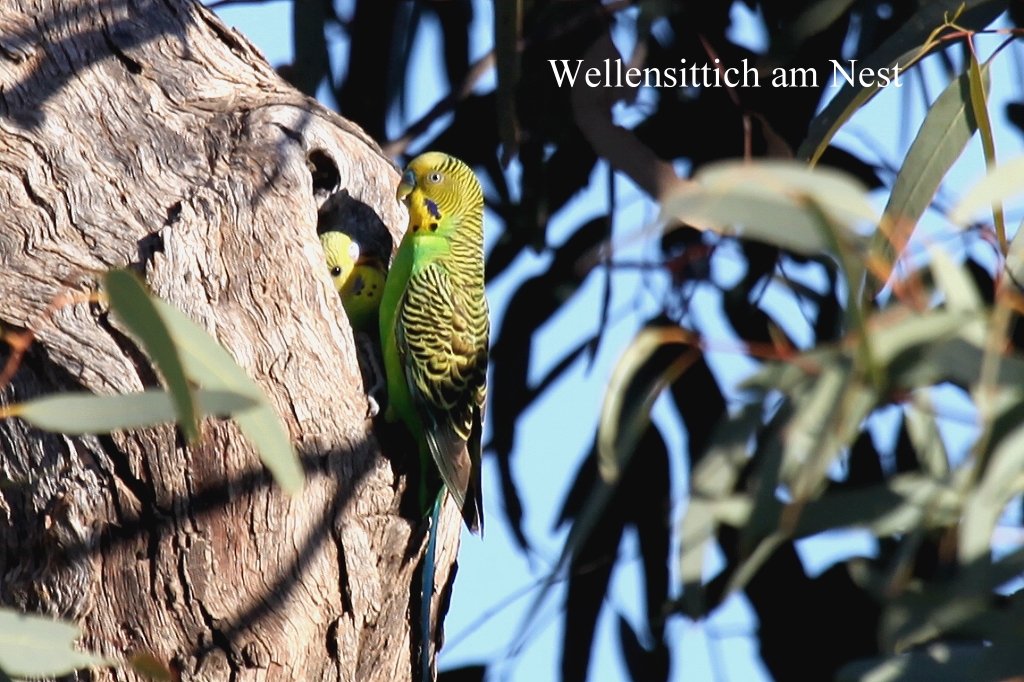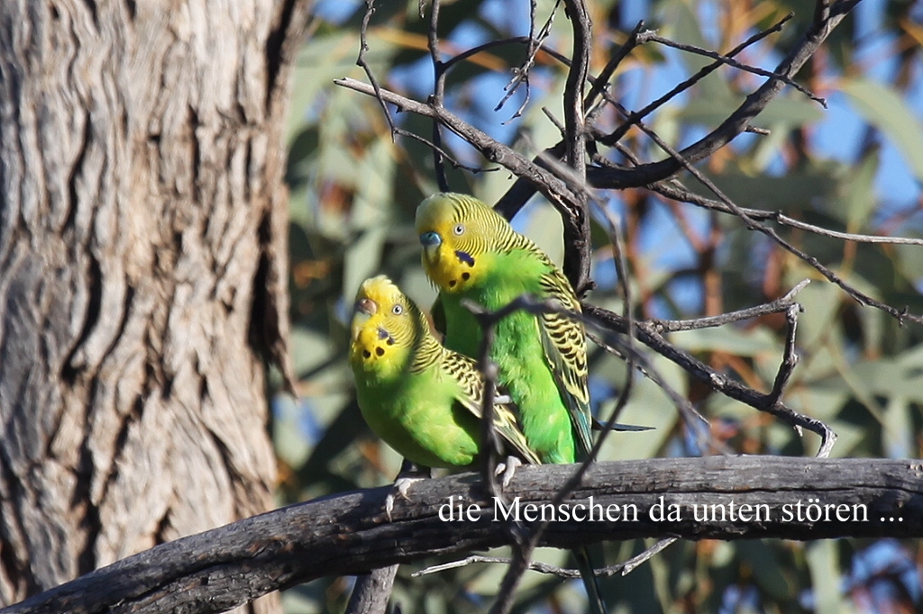 Später nahm sie sogar die Aquarellfarben aus dem Koffer und fing an einen der knorrigen Gum Trees zu malen. So verbrachten wir den ganzen Nachmittag unter den Bäumen sitzend. Manchmal standen wir auf und machten eine kleine Runde in die nähere Umgebung. Dabei konnten wir einmal beobachten, wie 2 Wellensittiche intensiv mit einander schmusten und sich paarten.