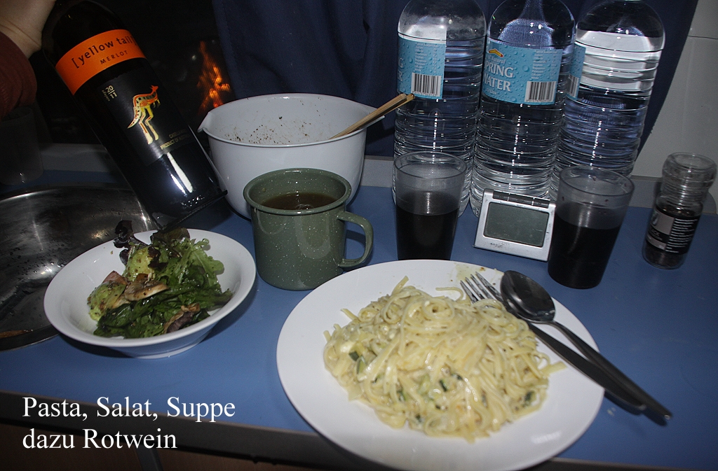 Am Himmel waren inzwischen dicke graue Wolken aufgezogen und alsbald fing es an zu regnen. Schnell gingen wir zum Auto zurück und verzogen uns ins trockene Innere. Es war zwar erst 15.45 Uhr, aber Tomoko fing schon mal an mit den Vorbereitungen fürs Abendessen. Ich begann mit meinem Tagebuch, während der Regen ziemlich heftig aufs Autodach trommelte. Als Tomoko mit dem Abendessen fertig war, hörte auch der Regen wieder auf. Die letzten Wolken verzogen sich rasch und machten einem wolkenlosen Himmel Platz. Heute gab es Polenta in Rotweinsauce mit Champignons, Tomaten und Zucchini, dazu tranken wir den Rest Merlot von gestern, schmeckte wieder toll. Es ist immer wieder erstaunlich, welche schmackhaften Gerichte Tomoko mit unserem primitiven Kocher und Zubehör hinbekommt. Es wird immer früher dunkler und die Kälte kriecht schnell in unsere Klamotten, aber mit unserem Heizgerät ist es im Auto wohlig warm. Hier schrieb ich noch mein Tagebuch von heute und beantwortete einige der erhaltenen E-Mails, die ich morgen abschicken werde. Heute nahmen wir uns auch die Zeit für eine ausgiebige Dusche nach 2 Tagen, die uns sichtlich gut tat. Später noch etwas lesen (Tomoko hatte ein interessantes Buch über Papageien gekauft) und planen für die letzten Tage, dann gingen wir wieder früh um 21.45 Uhr schlafen. |
