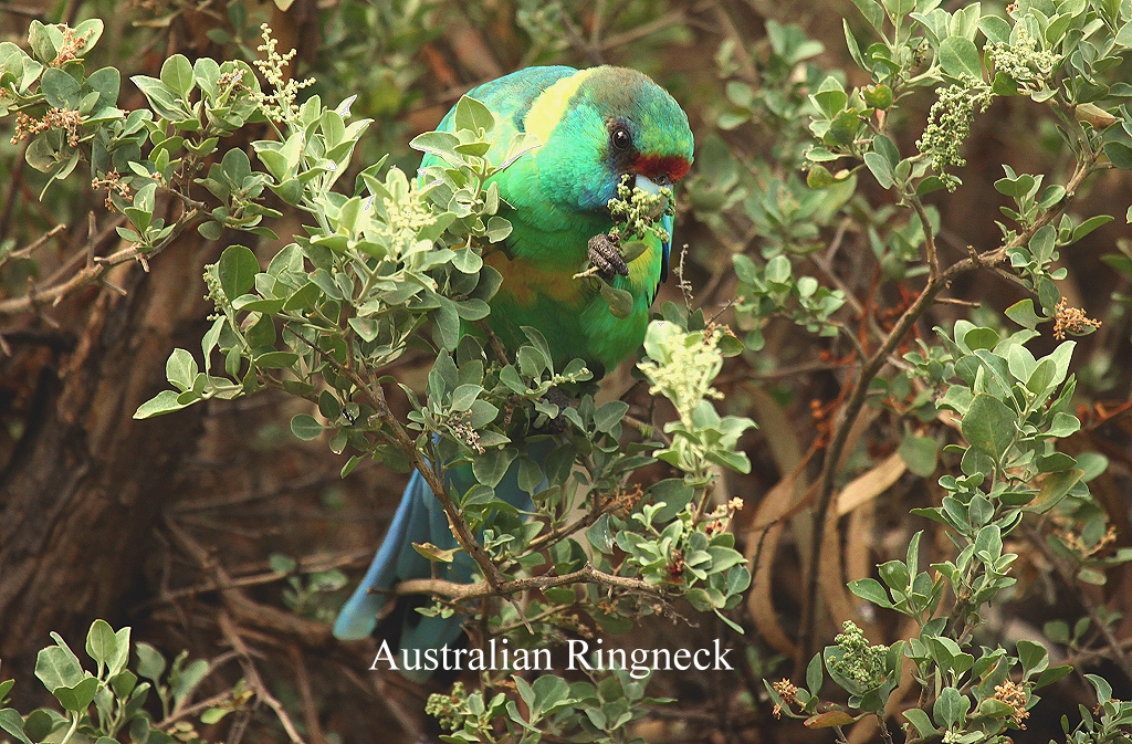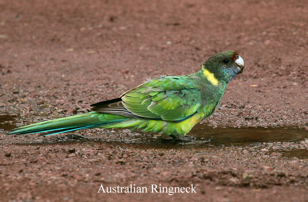 Im Visitor-Center selbst trafen wir ein deutsches Paar, das gestern versucht hatte, mit seinem Campingbus die Brachina Gorge zu erreichen. Sie mussten ihr Vorhaben beenden, da wegen starken Regens die Piste so aufgeweicht war, dass ihr Auto an einer der kurzen extremen Steigungen einfach zur Seite wegrutschte. Da hatten wir ja wirklich richtig gelegen mit unserer Entscheidung, einen Tag länger in Innamincka in der Sonne zu bleiben. Wir buchten einen Platz mit Strom- und Wasseranschluss für 3 Nächte zum Preis von 33,- $ pro Nacht. Wir waren von Bäumen umgeben. Insgesamt gefiel uns der Platz zunächst etwas besser als der Rawnsley Caravan-Park, wo wir letzte Woche übernachtet hatten (Nach 2 Tagen waren wir anderer Meinung, da die Vogelwelt im Rawnsley Park wesentlich interessanter war). Wir machten uns einen Kaffee und aßen dazu einen Carrot-Cake aus unserem kleinen Vorrat. Anschließend spazierten wir durch die nähere Umgebung. Einige Papageien (Australian Ringnecks) kletterten in den Zweigen eines Busches vor dem Visitor-Center. |