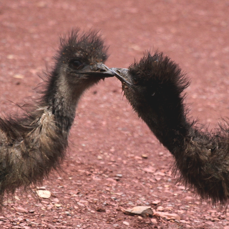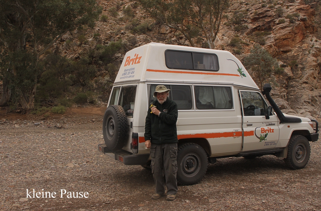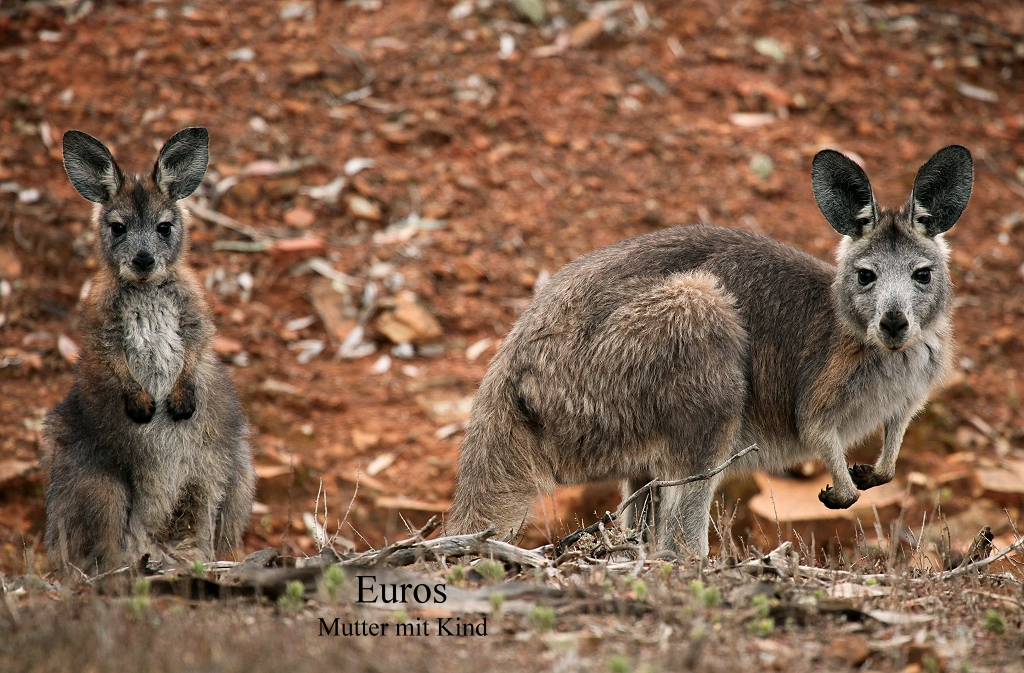 Vielleicht waren die nach wie vor sehr niedrigen Temperaturen die Ursache dafür. Wir blieben jedenfalls eine Dreiviertelstunde hier stehen, beobachteten intensiv diese wirklich wunderschönen vom Aussterben bedrohten Tiere. Ich machte auch ein Video von ihnen. Die Wolken hingen dicht zwischen den schroffen Felsen. Ein Adler kreiste über uns. Der eiskalte Wind trieb uns dann wieder ins Auto zurück und wir fuhren weiter. Ein Stück weiter um 12.50 Uhr in einer Kurve, kurz vor der Abzweigung in die Brunyero Gorge, standen plötzlich 3 Emus wie Wächter am Rand der Piste. Nun lagen noch 30 km Geröllpiste vor uns. Der Weg schlängelte sich in zahlreichen Windungen durch die enge Schlucht um dann wieder auf ca. 600 m anzusteigen, wobei einige sehr steile, aber kurze Steigungen zu bewältigen waren. Unser Auto schaffte das spielend mit seiner 4,5 Liter-Maschine. Wir überholten einen Radfahrer an einer besonders steilen Stelle, alle Achtung! Ansonsten war nicht viel Verkehr. An einer Stelle hielten wir an, da kleine Vögel in einer Wasserpfütze auf der Piste Wasser tranken.Dabei sahen wir ein Känguru (Euro) mit Kind, die beide zunächst neugierig zu uns schauten und plötzlich in großen schnellen Sprüngen davonstürmten. |