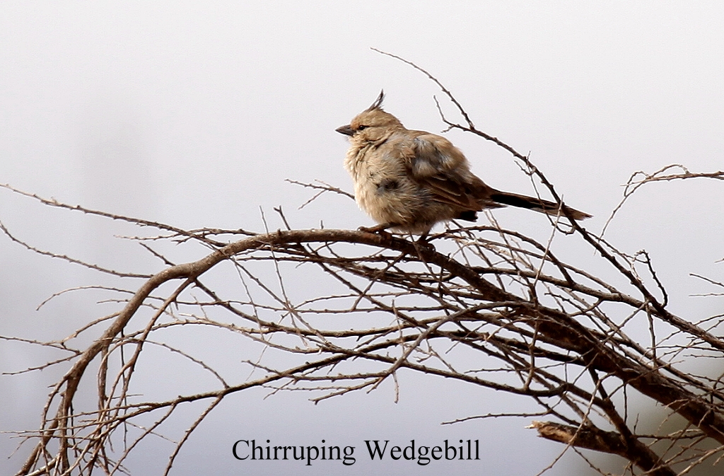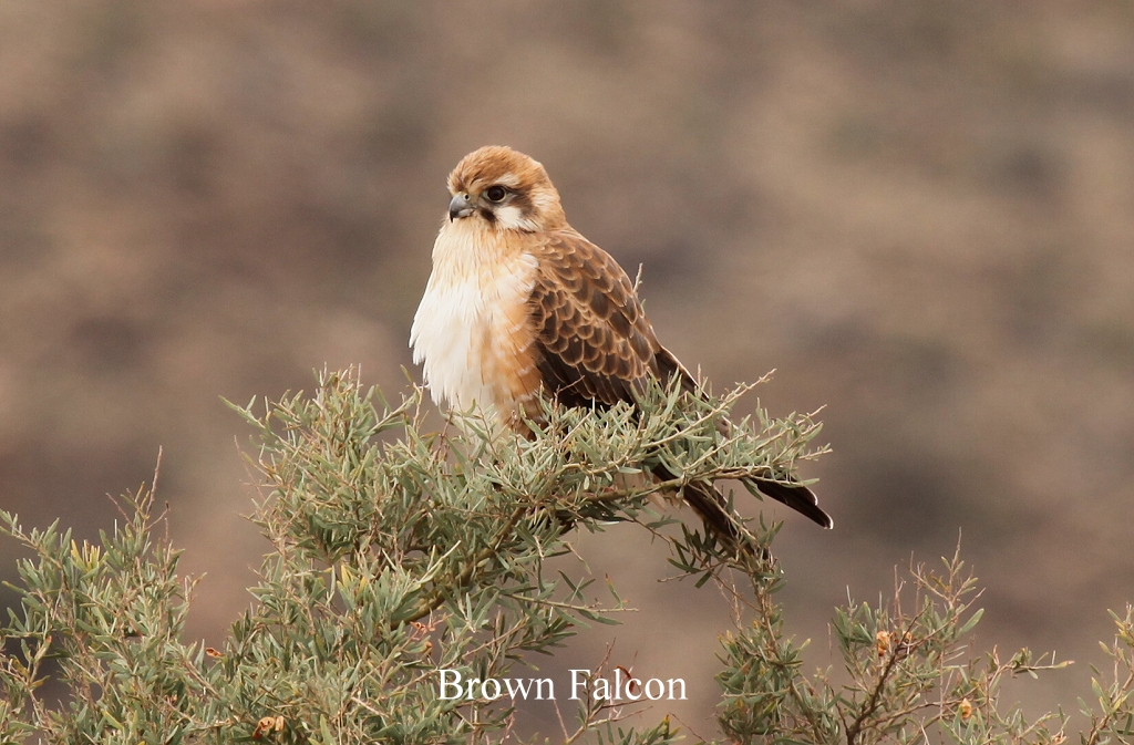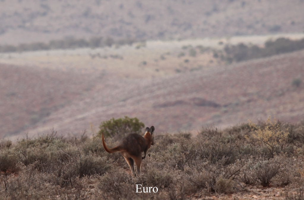 Ab hier war wieder Waschbrettpiste für die nächsten ca. 50 km angesagt. Kurz vorher hatten wir einige Singing Honeyeater gesehen, sowie einige Spiny-cheeked Honeyeater. Gleich nach der Abzweigung waren weitere Vögelchen zu sehen, zum Teil noch nicht gesehene, wie der Chirruping Wedgebill, ein lustig aussehendes Vögelchen mit einer Antenne auf dem Kopf. Nach kurzer Fahrt entdeckten wir auch wieder einmal nach einigen Tagen ein Känguru, höchstwahrscheinlich ein Euro. Auf einem Baum saß ziemlich nah ein Brown Falcon, der aber beim Näherkommen wegflog. |