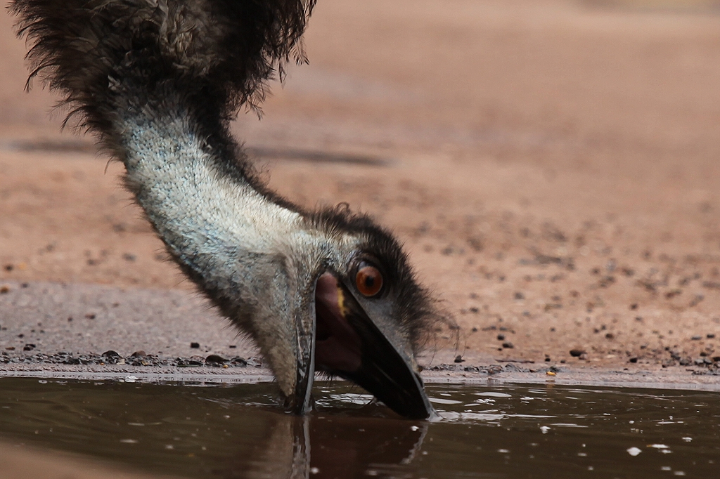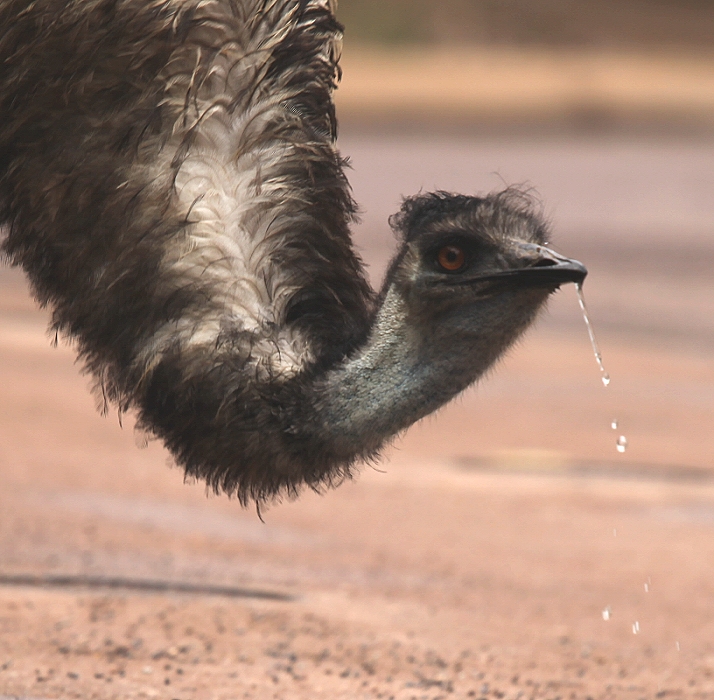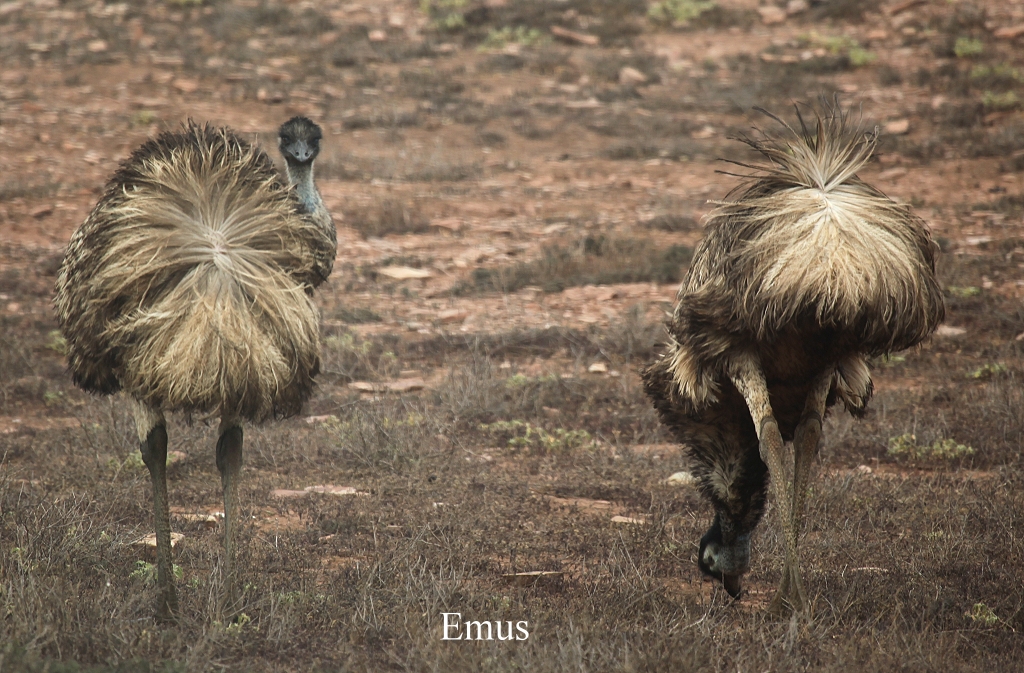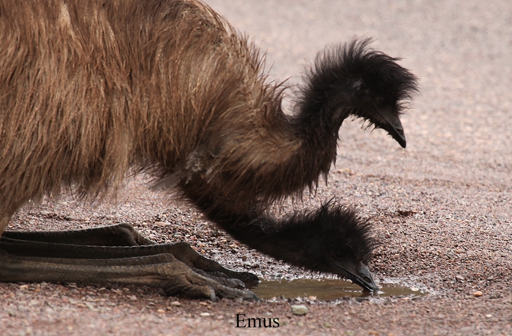 Um 13.55 Uhr erreichten wir endlich wieder festes Terrain. Nun waren es nur noch 10 km bis zu unserem heutigen Ziel Wilpena Pound, das wir nach insgesamt 140 km um 14.05 Uhr erreichten. Am Visitor-Center trafen wir einige Emus, die auf der Straße spazierten und Wasser aus verschiedenen Pfützen tranken. |