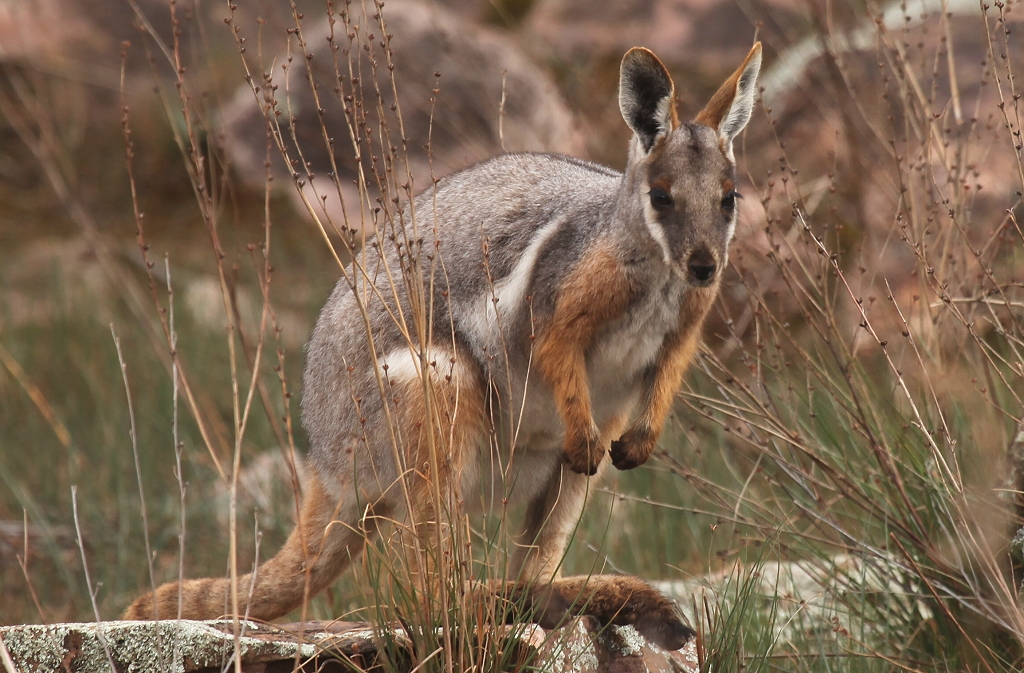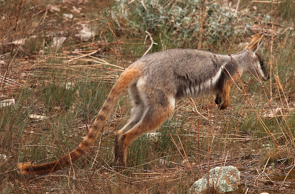 Es hatte offensichtlich gestern geregnet, weil die Wasserlöcher, die wir durchfahren mussten, mit viel Wasser gefüllt waren und auch die Piste nicht mehr staubig war. Gegen 11.45 Uhr erreichten wir die Stelle, wo wir vor einer Woche ein Yellow-footed Rock-Wallaby gesehen hatten. Wir stiegen aus und tatsächlich sahen wir 4 Rock-Wallabies ganz friedlich im hohen Gras, bzw. auf den Felsen sitzen, und das in der Mittagszeit, wo sie normalerweise sich versteckt halten. |