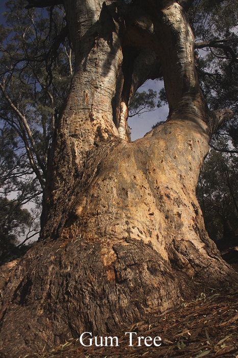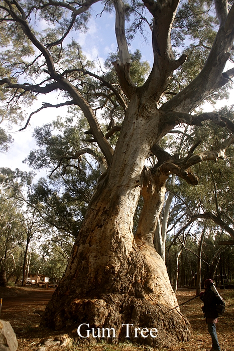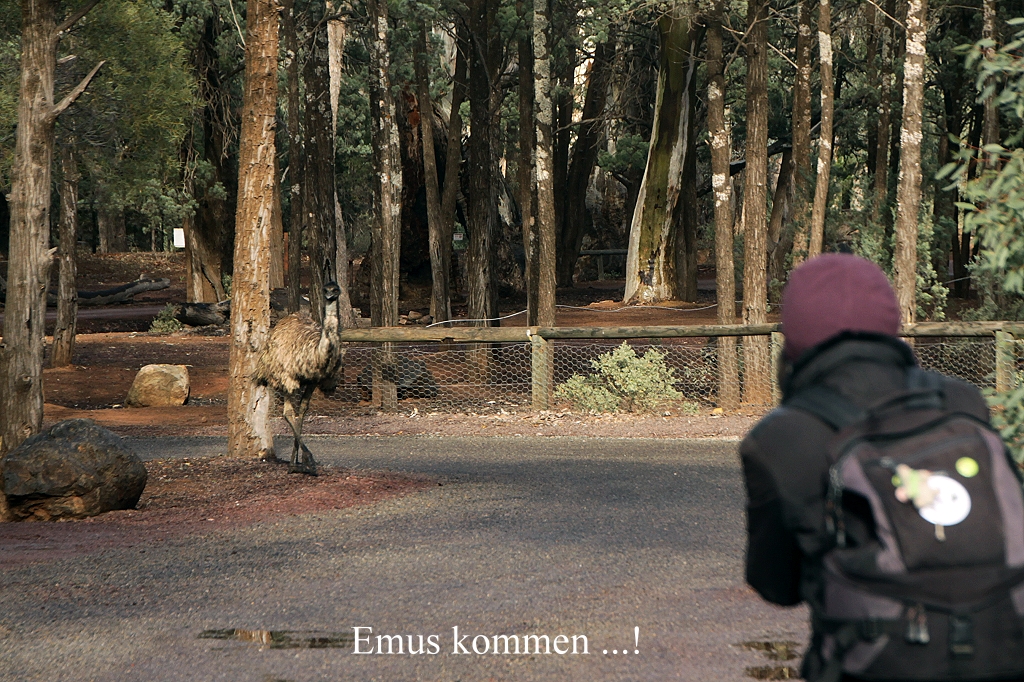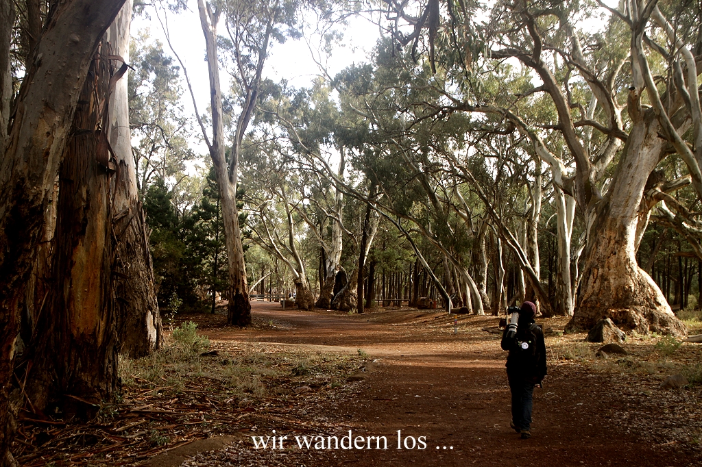 Die Außentemperatur lag bei 14°, ein bisschen zu kalt für ein gemütliches Sitzen draußen, aber für eine Wanderung sicherlich ideal. Der Sprühregen hatte inzwischen aufgehört, aber es lagen immer noch bedrohlich dunkle Wolken über dem Talkessel. Wir machten uns jedenfalls gegen 9.30 Uhr auf zu einer kleinen Wanderung zunächst unter den großen Eukalyptusbäumen (Gum Trees) hindurch. |