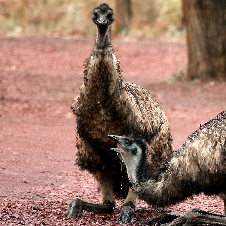 Wir entschieden uns für den "Drought Busters Hike", einen insgesamt 3,5 km langen Rundweg, der aus dem Tal auf 600 m Höhe hinauf und dann in einer Schleife wieder zurückführte. Gleich zu Anfang wurden wir von einigen Emus mit Nachwuchs in Augenschein genommen, die aber ruhig am Boden pickend weiter zogen. |