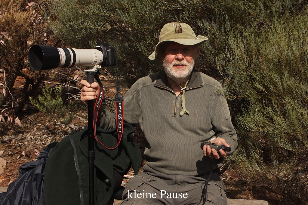 Das Gelände wurde offener und bot an einigen Stellen eine tolle Aussicht über Wilpena Pound und die umgrenzenden Berge. An einer Stelle versuchte Tomoko 10 Minuten lang einen Weebill, ein kleines quirliges Vögelchen, zu fotografieren, was sie zunehmend erschöpfte. Gott sei Dank war dort gerade eine Bank in der Nähe, auf der wir ein wenig rasten konnten. |