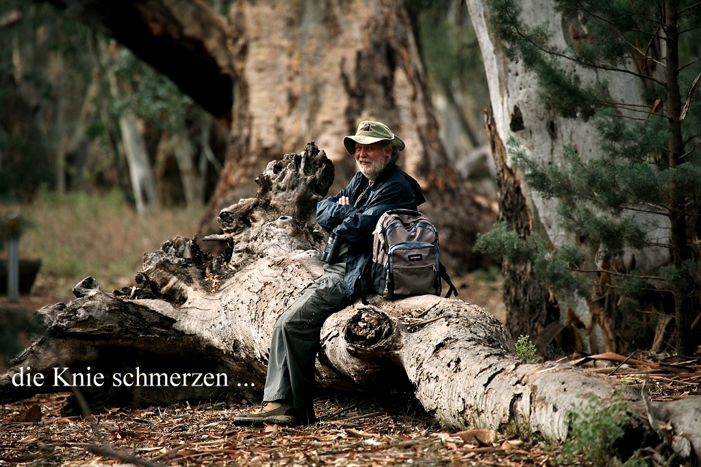 Um 10.15 Uhr hörten wir nach langer Zeit mal wieder den lachenden Ruf eines Kookaburra aus der Ferne. Auch einen Red-capped Robin und einen White-plumed Honeyeater bekamen wir zu Gesicht. Beim weiteren Anstieg verließen wir die dichte Population von alten Eukalyptusbäumen. |