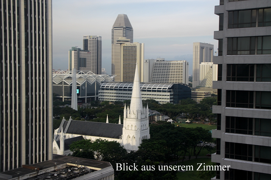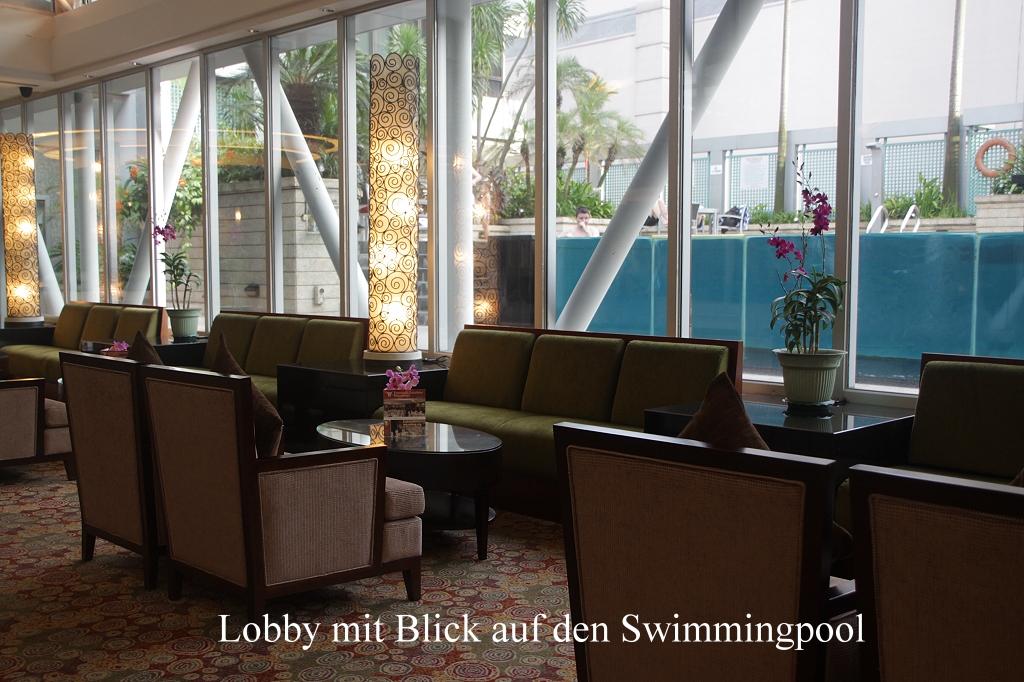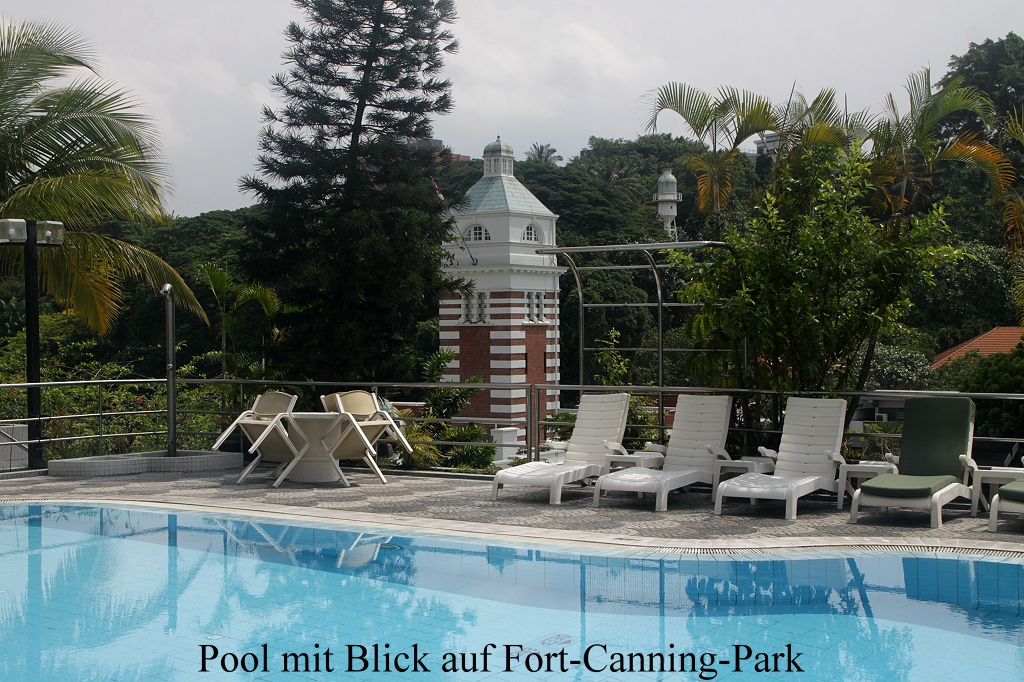 Da das Wetter inzwischen sehr sonnig war, nutzte ich die Gelegenheit für einen Besuch des Swimmingpools, der im 4.Stock lag mit herrlichem Blick auf den gegenüberliegenden "Fort-Canning-Park". Hier blieb ich 2 Stunden und las die Tageszeitung, immer wieder unterbrochen von ein paar Längen Schwimmen im Pool. |