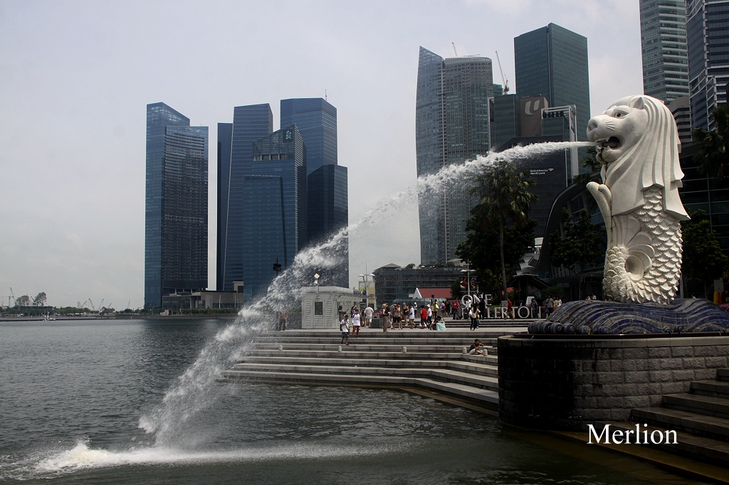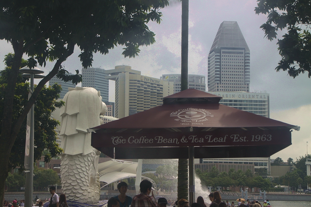 Weiter gingen wir am Hotel Fullerton vorbei, wo etliche westliche Leute, meistens ziemlich junge, im Freien auf der Terrasse speisten und dazu Champagner tranken. Tomokos Kräfte schwanden in der Hitze merklich, so dass sie sich nur noch mühsam vorwärts schleppen konnte. Endlich erreichten wir das angestrebte klimatisierte Café "Coffee Bean". Tomoko bestellte für sich einen Marocco-Mint-Tee, der ihr aber wegen unerwartetem Schokoladengeschmack gar nicht schmeckte, für mich einen Eis-Cappuccino, der besser war. Dazu gab es ein Stück Rasberry-Cheese-Cake, der allerdings lecker war. Ich ging noch mal nach draußen und machte ein paar Fotos vom Wasser speienden Löwen (Merlion) und seiner Umgebung. |