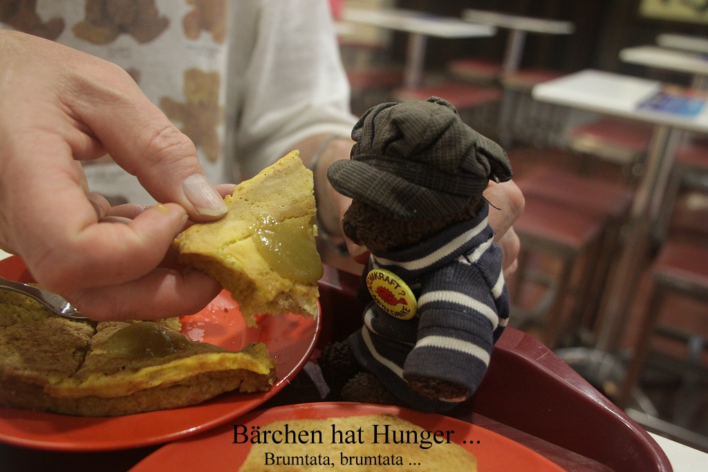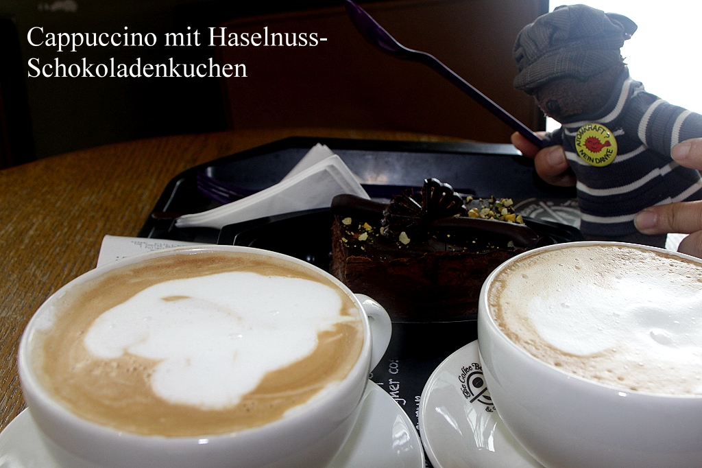 Viele Touristen wuselten durcheinander und suchten die besten Positionen für ein Foto. Der Himmel war bedeckt und es regnete leicht. Tomoko spannte ihren grünen Schirm auf. In einem nahen Café nahmen wir Platz und bestellten je einen Cappuccino sowie ein Stück Haselnuss-Schokoladenkuchen, den wir redlich teilten, d.h. ich bekam 2 Drittel, Tomoko den Rest... |
