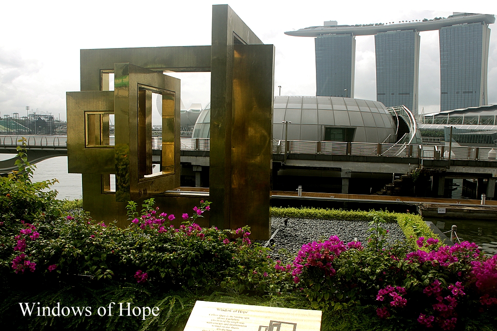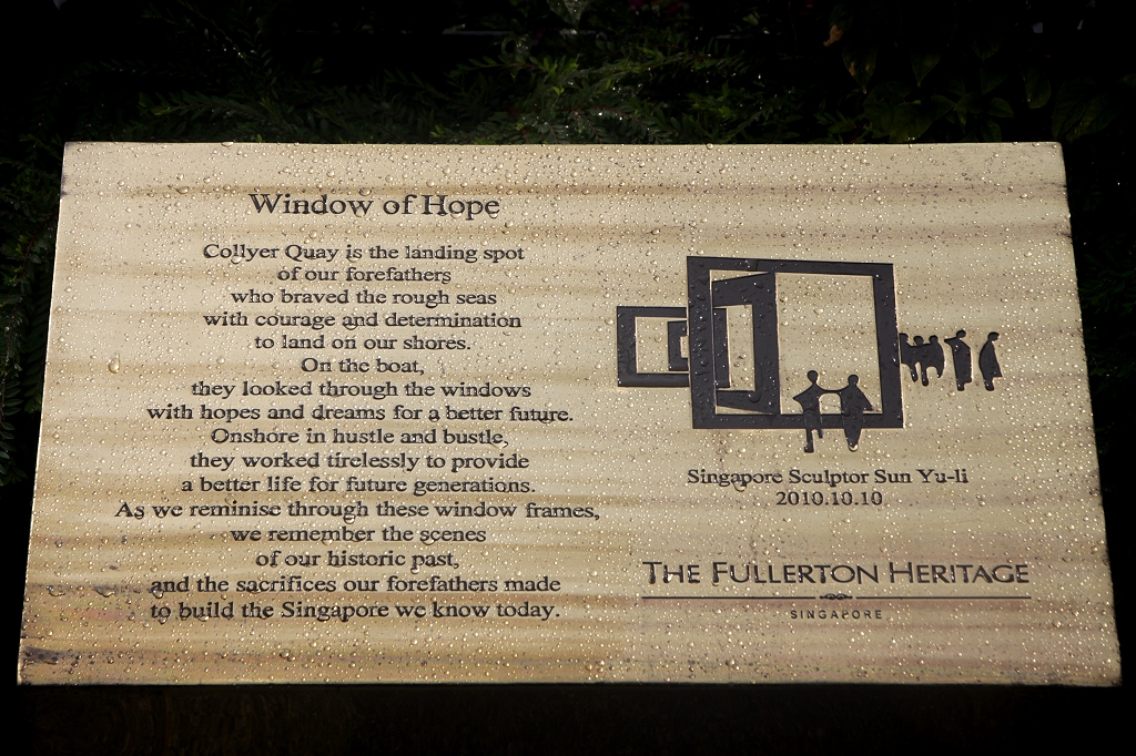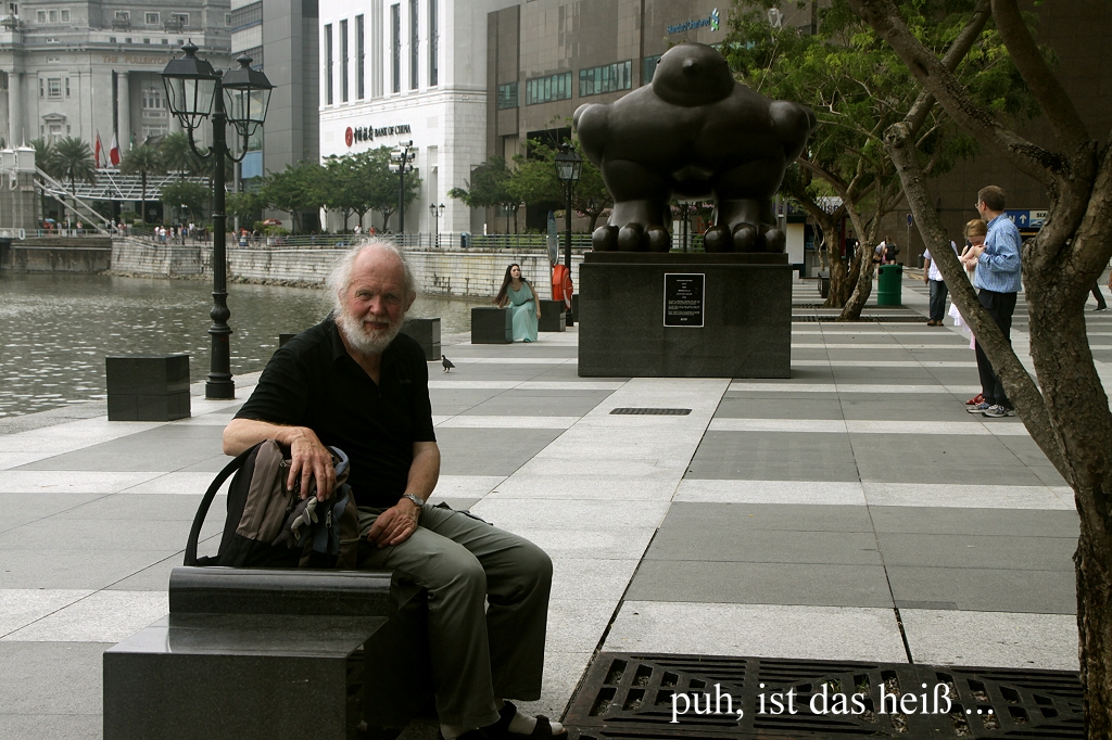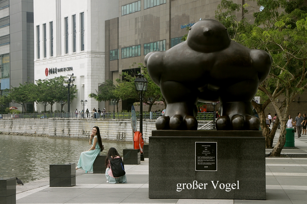 Am Nachmittag wollten wir noch mal zur Marina Bay, dort wo der Wasser speiende Steinlöwe steht. Da die Sonne heiß vom Himmel brannte, nahmen wir die U-Bahn zum Raffles Place. Als wir ins Freie kamen, hatte ich für einen Moment die Orientierung verloren. Wir fanden aber nach ein paar Umwegen doch noch den richtigen Weg zum Singapore River, wo wir erst mal eine kleine Pause in der Hitze machten. Neben einer Riesenvogel-Plastik schauten wir einigen Sperlingen zu. |