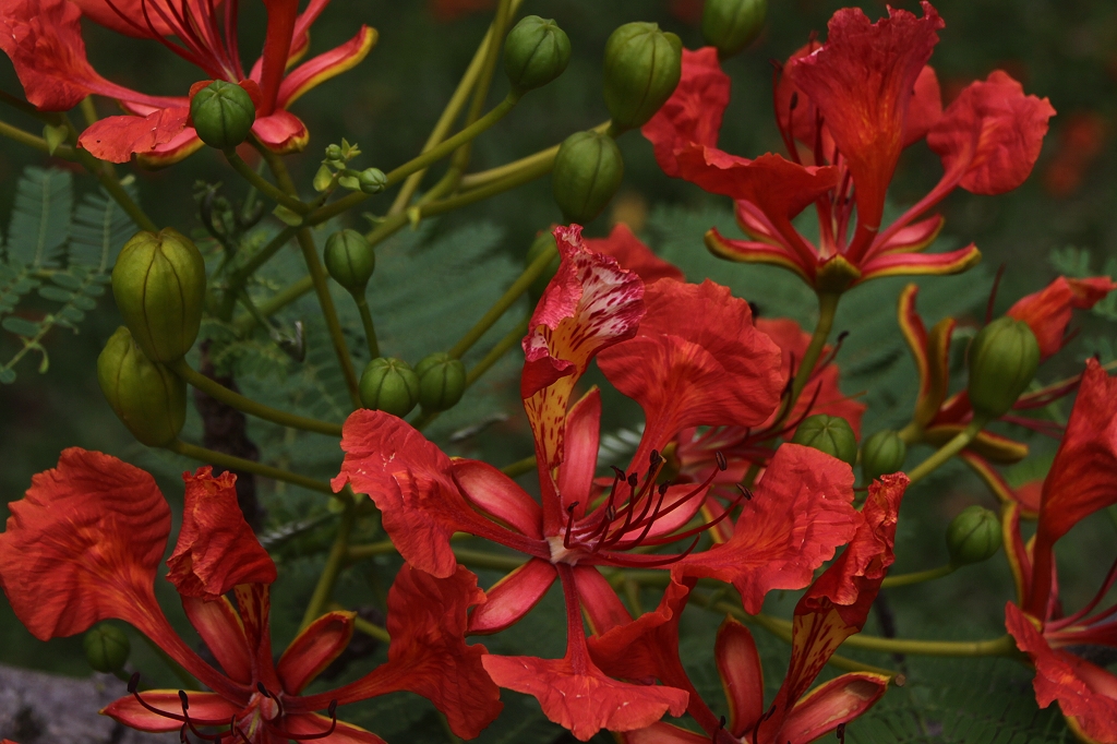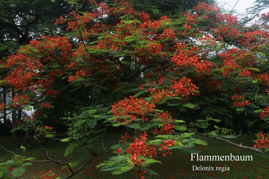 Als wir zurück auf dem Zimmer waren, maß ich auch spaßeshalber mal meine Körpertemperatur und erhielt mit 35,4° exakt das gleiche Ergebnis wie Tomoko am frühen morgen. Ich wollte noch gerne einen Spaziergang in den gegenüberliegenden "Fort Canning Park" machen und mir den in der Karte eingezeichneten See etwas näher anschauen. Da wir zur Mittagszeit unser Zimmer räumen mussten und Tomoko doch noch etwas geschwächt war, hielten wir es für sinnvoller, dass ich alleine ging. Also wanderte ich gegen 8.30 Uhr los. Die Sonne brannte heiß vom Himmel. Gleich am Parkanfang stand ein herrlicher Flammenbaum (Delonix regia) in voller Blüte. |