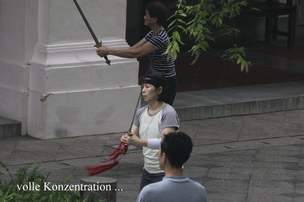 Ich umrundete den gesamten See im Schatten der wunderschönen alten exotischen Bäume, das Wasser sah ich jedoch nicht, da es von einem hohen Sicherheitszaun abgesperrt war. Offensichtlich gilt der See als Trinkwasserreservoir und ist deshalb nicht für die Öffentlichkeit zugänglich. An einer Stelle waren einige sportliche Leute dabei mit jeweils einem Schwert in den Händen rhythmische Gymnastik, wahrscheinlich Kendo, zu betreiben. Ich kam schon beim Zuschauen mächtig ins Schwitzen. |