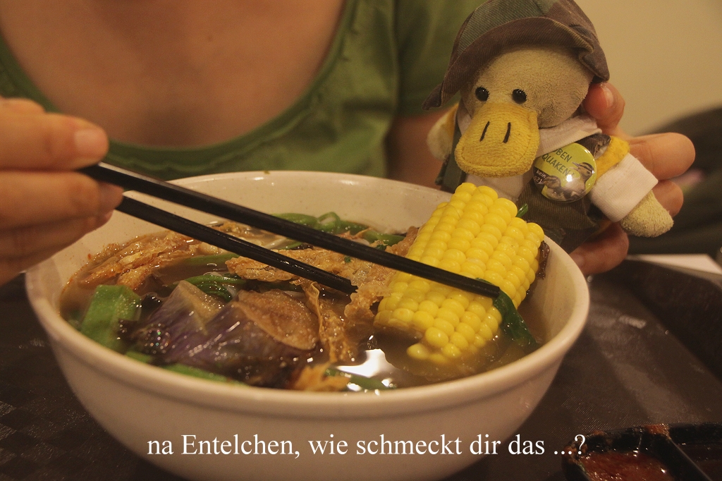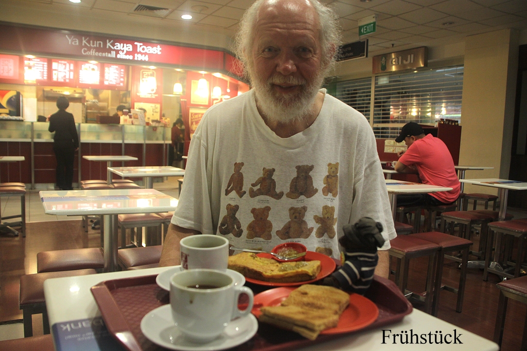 Tomoko erwachte schon sehr früh um 5.30 Uhr und fühlte sich wohl. Das Fieberthermometer zeigte nur 35,4°, also offensichtlich kerngesund. Da es draußen noch dunkel war, blieben wir noch eine Weile liegen. Zum Frühstück gingen wir wieder an den gleichen Imbissstand, wie schon die Tage zuvor. Als wir gegen 7.45 Uhr dort eintrafen, war erst ein einziger Gast da, na ja, es war halt Sonntagmorgen und die Shopping Malls waren noch geschlossen um diese Zeit. |