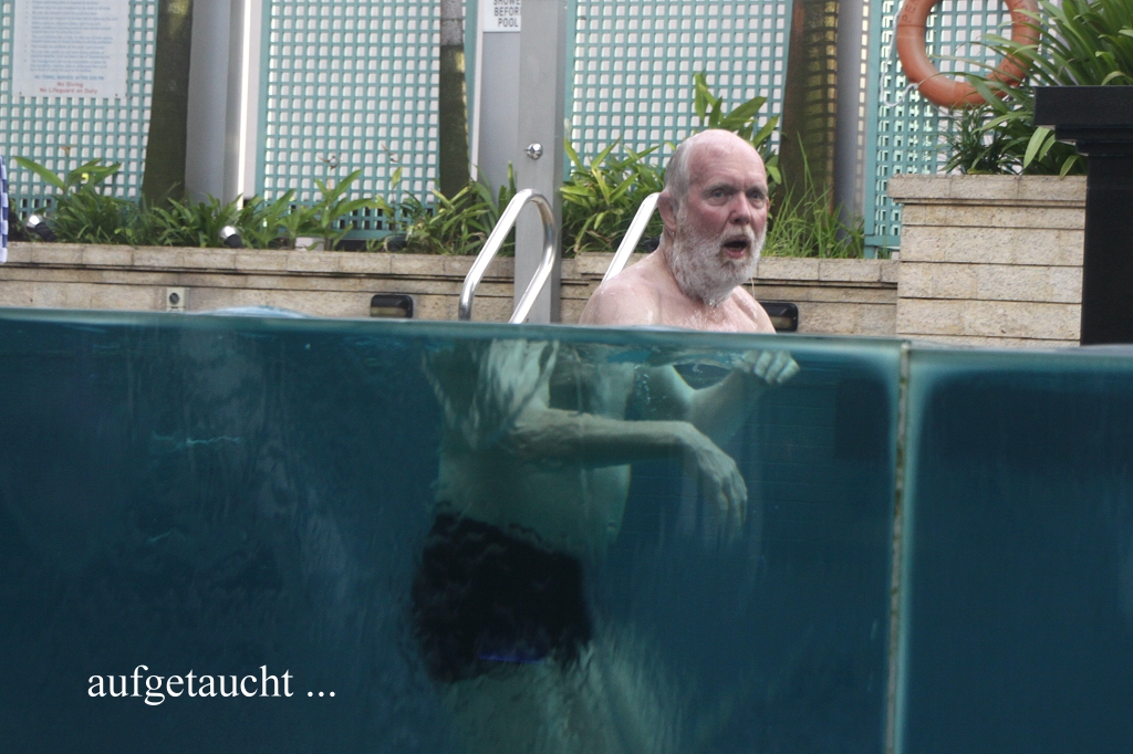 Dann machten wir uns wieder auf den Rückweg zur U-Bahn-Station. Auf dem Weg dorthin kamen wir an einer 3-4 m hohen Skulptur von Salvador Dali vorbei. Zurück bei der City-Hall trennten sich unsere Wege. Tomoko wollte noch mal in die Raffles Mall und ich in den Swimmingpool. Bevor ich das tat, nahm ich mir zunächst in der Lobby des Hotels die Sonntagszeitung in die Hand und setzte mich damit in einen Sessel. Nach einiger Zeit kam Tomoko erschöpft zurück, wobei sie anfangs den Rückweg zum Hotel nicht gefunden hatte. Nochmals gingen wir in die Food Mall und aßen beide ein koreanisches Bibimbap. Es war schon erstaunlich, wie oft wir in Singapur Appetit hatten… Nun wurde es aber langsam Zeit, den Swimmingpool zu benutzen. Ich zog mich um und schwamm kurz ein paar Mal hin und her. Dieser Pool war insofern etwas Besonderes, da man von der Hotel-Lobby durch eine gläserne Seitenwand die Schwimmer wie in einem großen Aquarium beobachten konnte. Tomoko machte auch gleich ein paar Fotos von mir. |