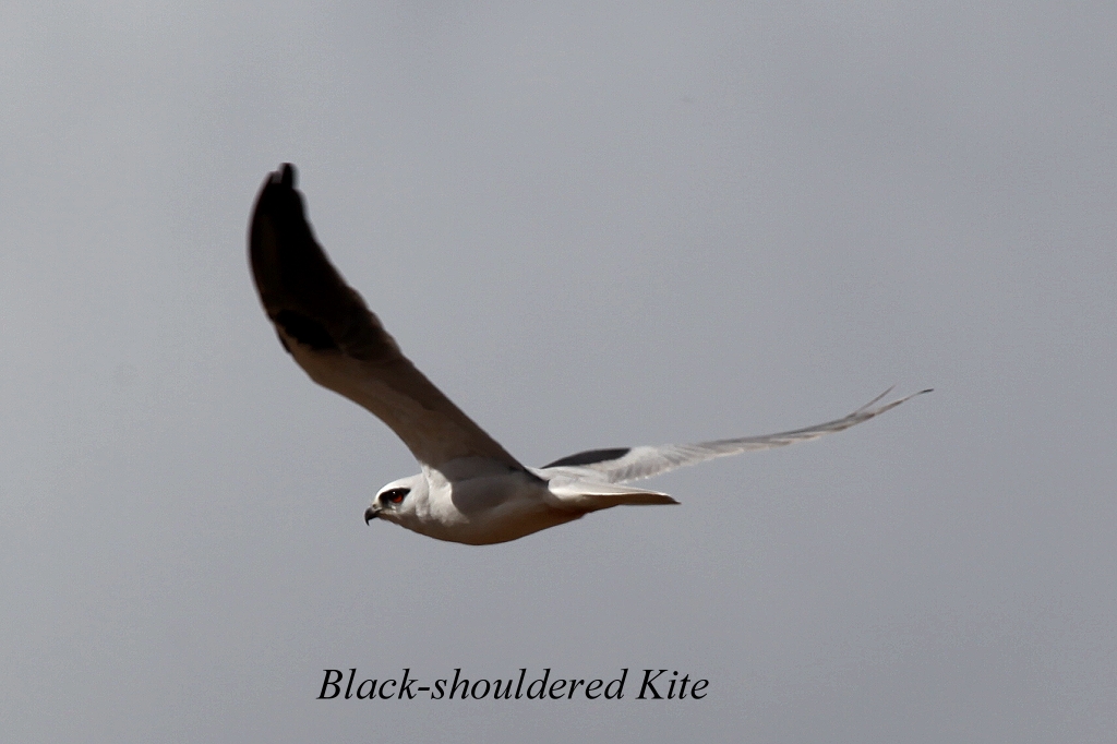 wo wir, sehr zur Freude unserer Bären, uns je ein Stück Cheese-Cake mit Cappuccino gönnten. Eine Möwe mit zwei jammernden Jungen spekulierten auf herabfallende Krümel. Wir fütterten sie aber nicht. Erst als wir wieder zum Auto zurückgingen, machten sie sich über unsere Teller auf dem Tisch her und pickten die übrig geblieben Krümel auf. Weiter gings über die South Coast Road immer Richtung Westen. Das Wetter war ganz ordentlich, immer wieder Sonne, unterbrochen von kurzen Regenschauern. Ein schöner Regenbogen war häufig zu sehen, mal stärker, mal schwächer. Einmal rief Tomoko "stop"! Sie hatte auf einem Baum einen Black-shouldered Kite sitzen gesehen. |