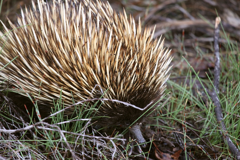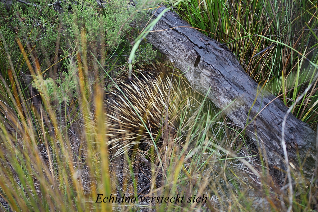 Als ich vorsichtig zurückfuhr, flog der Kite weiter. Tomoko schaffte es aber, ein Bild von ihm im Flug zu machen. Das Fahren bei wenig Verkehr ermüdete etwas. Etwa 10 km vor unserem Ziel, entdeckte ich im Vorbeifahren einen Echidna, ein in Australien heimisches igelähnliches Stacheltier. Schnell hielt ich an, doch beim Zurücksetzen war er zunächst verschwunden. Tomoko suchte aufmerksam die Büsche ab und tatsächlich entdeckte sie ihn wieder. |