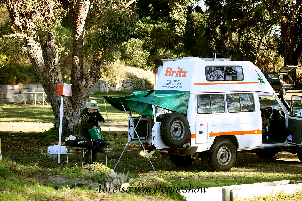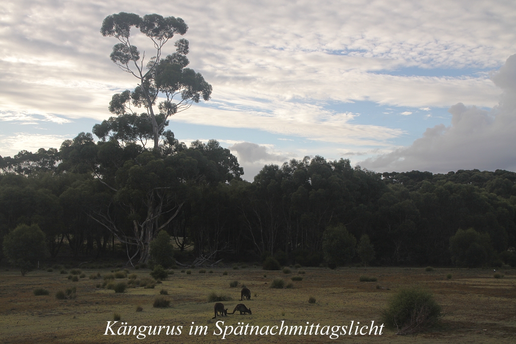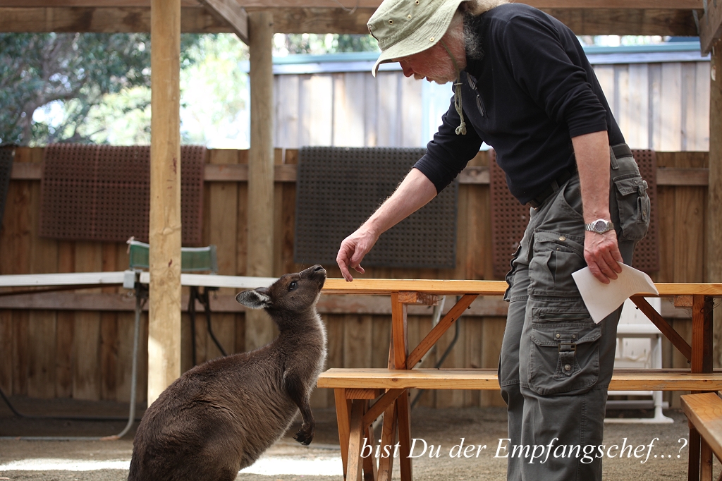 Endlich waren wir am Ziel, dem Western KI Caravan Park. Ich erledigte die Formalitäten, während Tomoko die Gastküche inspizierte. Ich buchte erst mal für drei Nächte (28 AUS$ pro Nacht) und ging nach draußen. Tomoko, im Küchenbereich stehend, winkte mir zu. Da stand doch tatsächlich ein Känguru, das neugierig zu mir kam, so dass ich es streicheln konnte. |