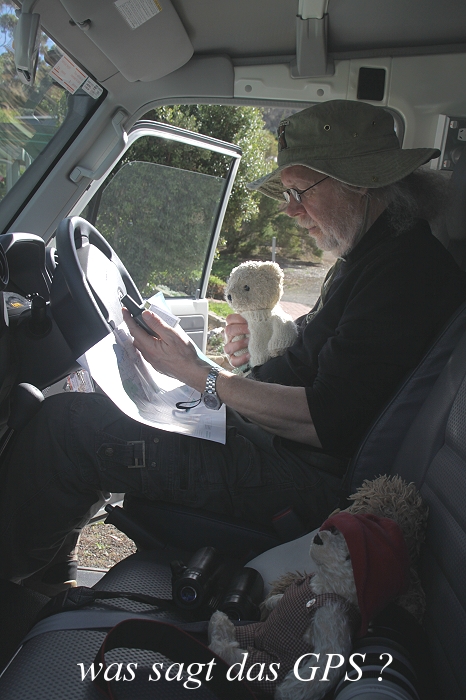 So wanderten wir langsam um den kleinen See herum und erreichten nach etwa 2 Stunden wieder unseren Ausgangspunkt. Unsere Beine waren müde geworden, also ruhten wir uns etwas aus. Tomoko machte einen Pfefferminz-Tee, zu dem ich mit den Bären einen gestern gekauften Donut aß, sowie eine Banane mit Äffchen. Tomoko stärkte sich mit Crackern und Käse. Gegen Mittag machte ich unser Auto startklar, indem ich die Markise abbaute. Wir fuhren einige km Richtung Osten zum "Koala Walk", einem kleinen privaten Gelände mit gepflanzten Eukalyptusbäumen, auf dem sich immer wieder Koalas aufhalten sollen. Nachdem wir die 5 AUS$ Eintritt pro Person bezahlt hatten, machten wir uns auf den Weg. Schon nach kurzer Zeit sahen wir den ersten Koala hoch in einem Baumwipfel sitzen. Drei weitere entdeckten wir noch. Einer war dabei genüsslich Eukalyptusblätter zu pflücken und zu verspeisen. Leider schauten sie nicht mal runter in die Kamera. Etliche Rosellas und Galahs flogen immer wieder zwischen den Bäumen durch. |