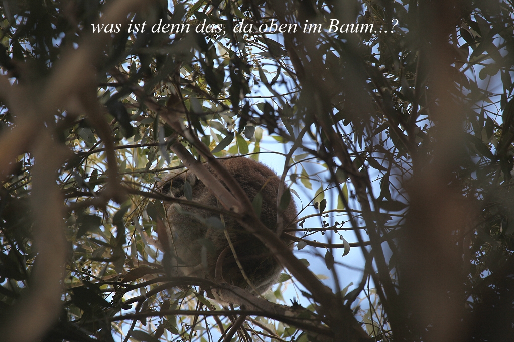 Während ich wie immer auspackte und die Campingutensilien installierte, machte Tomoko einen kleinen Rundgang. Überall kreischten Papageien. Identifizieren konnten wir Galahs, Lorikeets und Crimson Rosellas. Dann kam Tomoko zurück und machte ein merkwürdiges Gesicht. Sie hatte hoch in einem Baum ein seltsames Gebilde entdeckt, das sie mir unbedingt zeigen wollte. Um sicher zu gehen, um was es sich handelte, ging ich zum Auto zurück und holte mein Fernglas. Unterdessen kam ein junger Belgier hinzu und fragte Tomoko, ob sie den Koala in einem benachbarten Baum auch gesehen habe. |