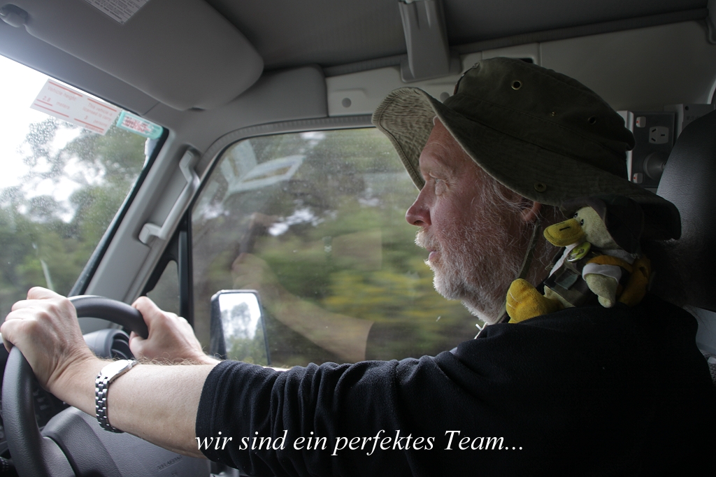 Gegen 7:00 Uhr wurden wir wach nach erholsamem Schlaf. Es hatte in der Nacht zwar wieder geregnet, doch jetzt war es trocken. Also bereiteten wir unser Frühstück draußen vor. Eine Frau, die hier dauerhaft auf dem Campingplatz lebt, zeigte uns direkt über uns einen Koala hoch im Baum sitzend. |