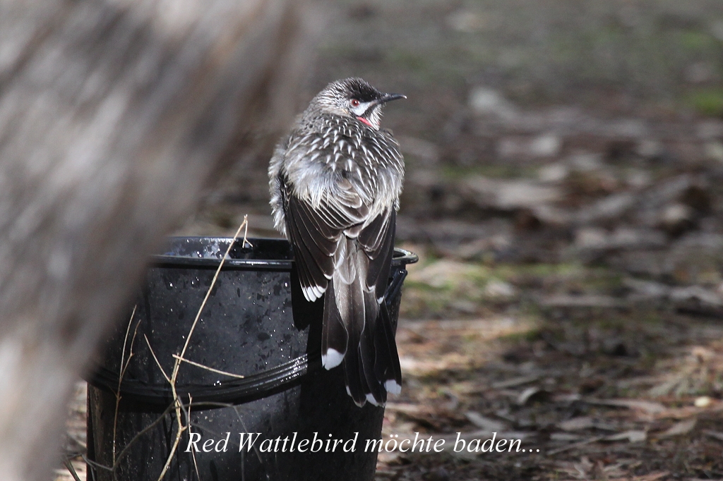 Später erfuhren wir, dass dieses Tier ohne Eltern war und von den Caravanpark-Besitzern mit der Milchflasche aufgezogen worden war. Wir konnten uns einen Stellplatz auswählen, wiederum mit Stromanschluss. Langsam machten wir eine Runde mit dem Auto und suchten nach einem geeigneten Stellplatz. Tomoko sah dabei einen Red Wattlebird, der gerade ein Bad nahm. |
