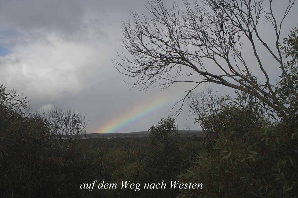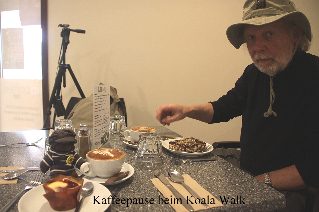Auch einige Wallabies hüpften herum. Nachdem wir eine gute 3/4tel Stunde umhergegangen waren, fing mein Knie wieder an zu schmerzen. Der erste Baumstumpf, auf dem ich mich etwas hinsetzen wollte, war voller Ameisen, also keine so gute Idee. Etwas weiter gab es dann eine bessere Gelegenheit. Da wir uns aber auf einen Kaffee freuten, gingen wir zurück zum Eingang ins dortige Café. Dort kauften wir uns je einen Cappuccino und ein Stück Kuchen, beides gut, aber recht teuer (17,- AUS$ zusammen). |