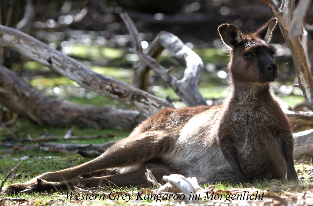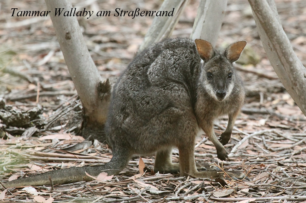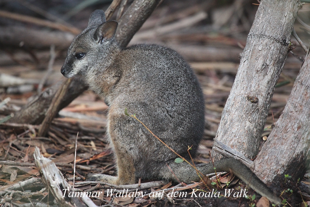 Nein, aber jetzt war klar, dass das merkwürdige Etwas hoch im Baum ein Koala war. Er saß leider viel zu hoch zwischen den Zweigen versteckt. Also gingen wir zu dem anderen Baum, und tatsächlich saß dort ein weiterer Koala, gar nicht so hoch und gut zu sehen. Er hatte die Augen geöffnet und bewegte sich sogar etwas. Das ist ja unglaublich, vor 4 Jahren hatten wir angestrengt nach Koalas Ausschau gehalten und hatten nur ein einziges Exemplar auf der ganzen Reise gesehen. Der junge Belgier, der schon einige Monate hier lebt, erzählte uns interessante Dinge über die Gegend hier. Er wollte uns den Koala-Walk zeigen, der hier vom Gelände abzweigte. Am Anfang dieses kleinen Rundwegs sahen wir zunächst 2 Wallabies. |
