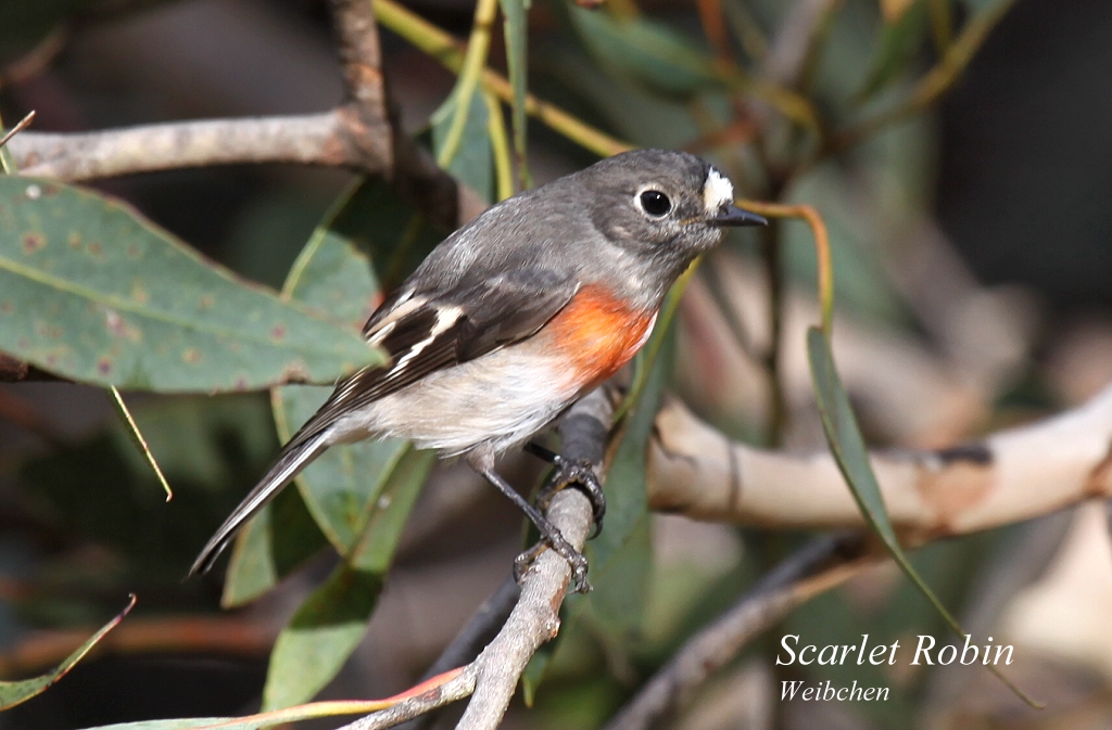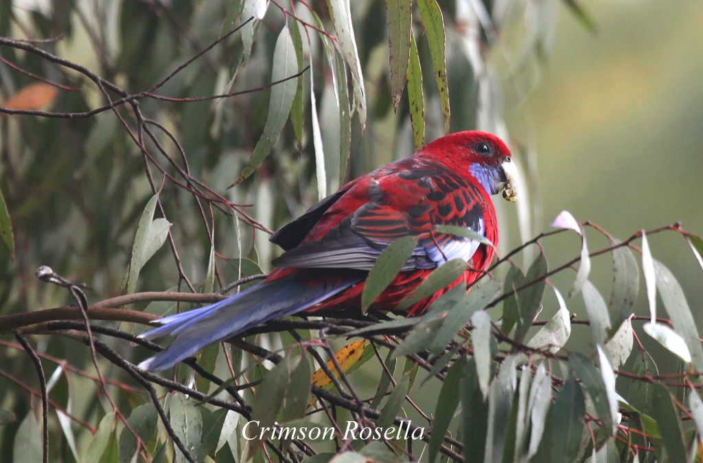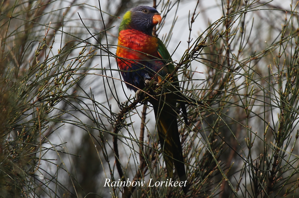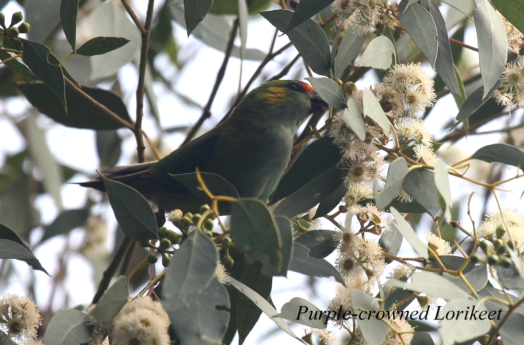 Das ist ja unglaublich. Er bewegte sich nicht. Auch der kleine Koala in der Nähe war noch da, hatte allerdings seinen Baum gewechselt. Die Galahs flogen schon laut kreischend durch die Baumwipfel, auch die Magpies mit ihrem melodischen Gesang waren schon da. Tomoko nahm schon früh ihre Kamera in die Hand und suchte in der Nähe nach passenden Motiven. Dabei konnte sie nach hartem Kampf einen Purple-crowned Lorikeet einigermaßen brauchbar fotografieren. Es gab zwar einen großen Schwarm davon, aber sehr hoch in den Baumwipfeln, gut von Blättern getarnt. Crimson Rosella, Superb Fairy Wren und Rainbow Lorikeet war da ein wenig einfacher. |