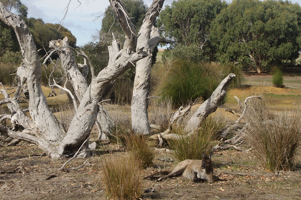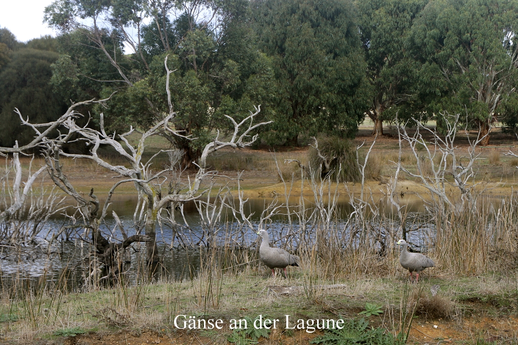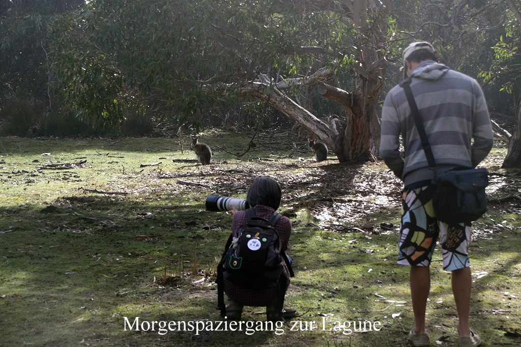 Julien, unser belgischer neuer Bekannter, kam rüber und gemeinsam wanderten wir einen kleinen Trail zu einer in der Nähe liegenden Lagune. Für diesen Weg braucht man normalerweise 15 min, doch immer wieder blieben wir stehen, da zahlreiche Vögel, sowie Kängurus und Wallabies zu sehen waren. |