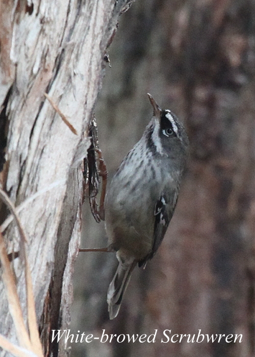 Wir stiegen aus um ein paar Fotos zu machen. Es war etwas schwierig, denn immer, wenn die Kamera klickte, versteckte sich das Tier schnell unter einem Grasbüschel und blieb regungslos für eine Weile. Wir gingen vorsichtig etwas voraus und tatsächlich folgte er uns, so dass wir doch noch zu unseren Fotos kamen. Wir fuhren weiter. Immer mehr Kängurus und Wallabies tauchten auf sowie ein Vögelchen, das wir später als Olive Whistler identifizierten. |