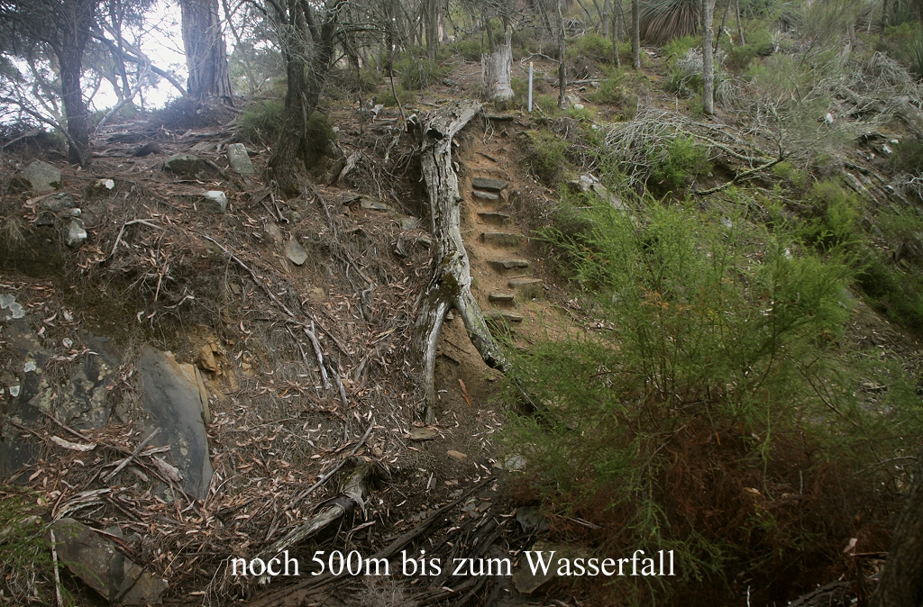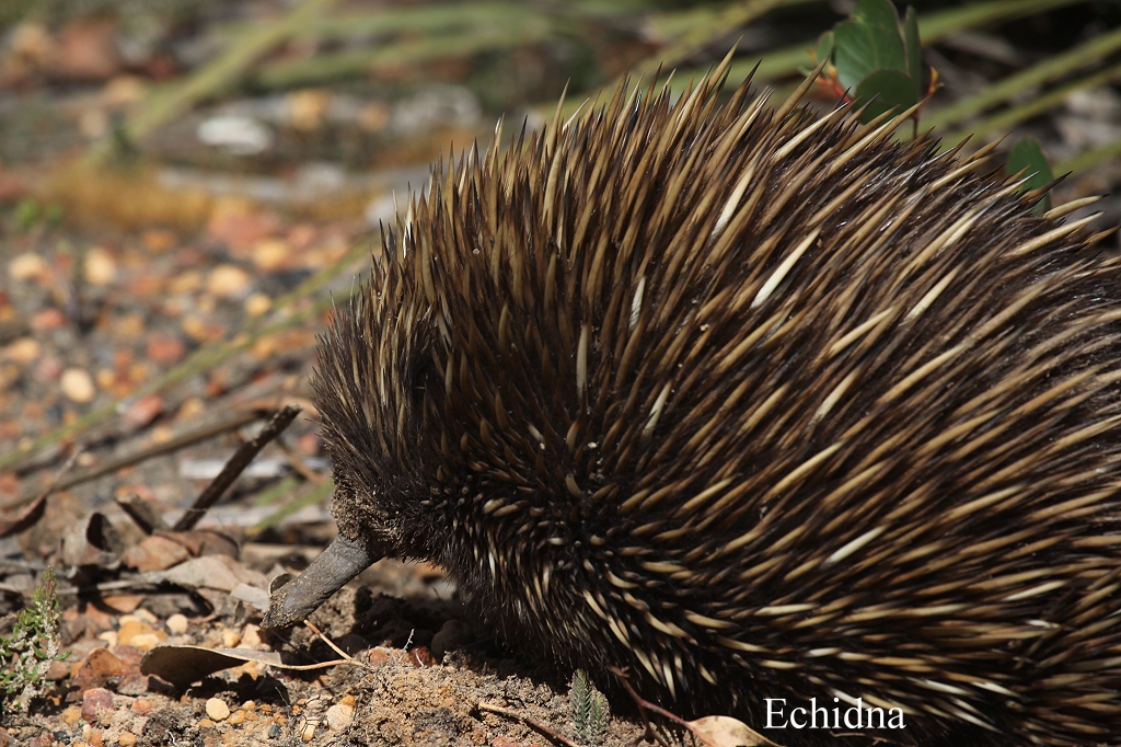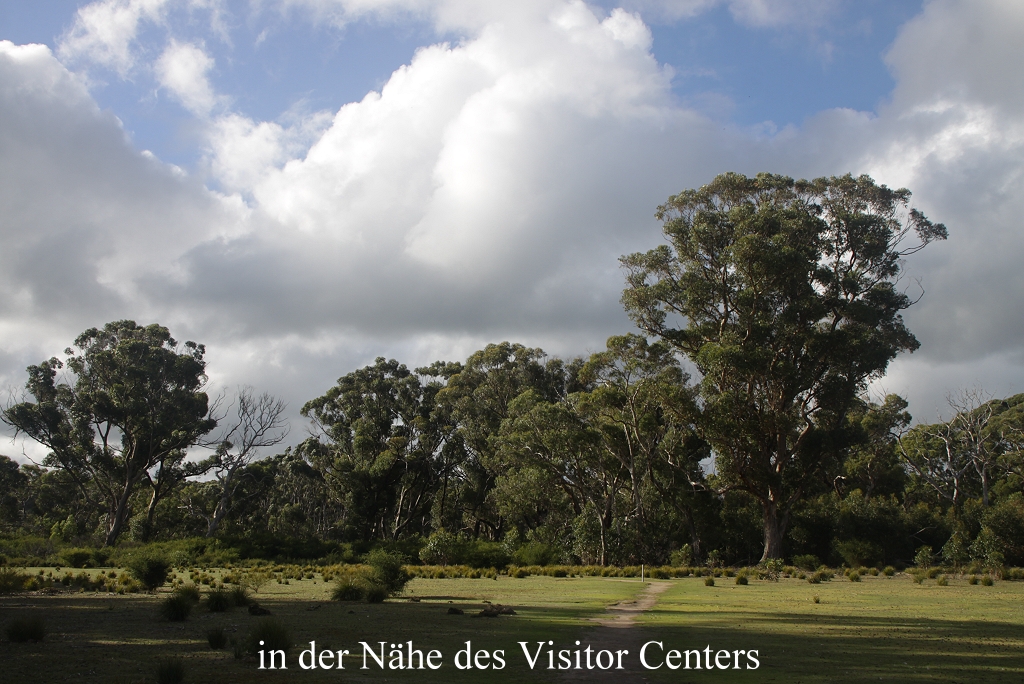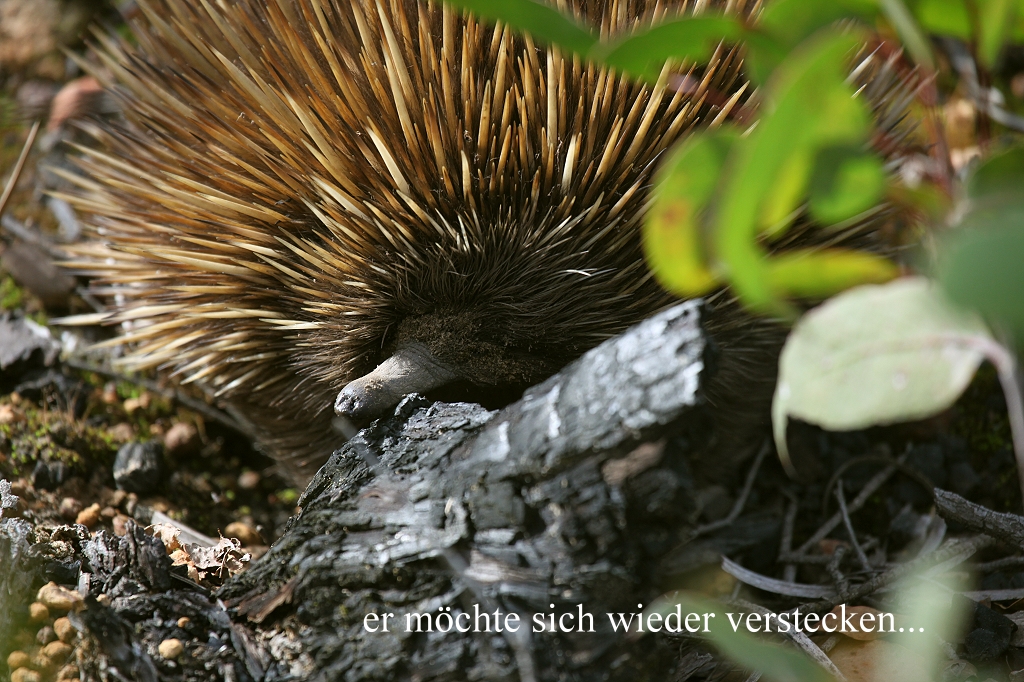 Ein kühler Wind wehte inzwischen und die Wolkendecke war sehr dicht geworden. Wir zogen uns also warm an und marschierten los. Der abfallende Weg führte zunächst durch dichte niedrige Eukalyptusgehölze. Nach etwa einem Kilometer waren auch immer wieder alte hohe Bäume darunter. Mit unseren Ferngläsern suchten wir intensiv die Bäume ab, doch von einem Glossy-black Cockatoo war nichts zu sehen. Überhaupt war es ziemlich ruhig im Wald. Nur einige der üblichen kleinen Waldvögelchen ließen sich blicken. Tomoko mit ihrer schweren Kamera blieb etwas zurück und blieb bei den Vögelchen, während ich forschen Schrittes Richtung Wasserfall marschierte. Nach 2 km stand ein Schild, das die Entfernung zum Wasserfall mit 500 m anzeigte. Da aber der Pfad teilweise mit Treppenstufen steil nach oben führte, verzichtete ich auf das letzte Stück und ging wieder zurück. Inzwischen war die Sonne wieder hinter den immer kleiner werdenden Wolken zum Vorschein gekommen und brannte doch ziemlich heftig vom Himmel. Da der Weg auch noch beständig anstieg, kam ich in meiner warmen Kleidung mächtig ins Schwitzen. Ich erreichte Tomoko, der es auch schon ziemlich warm war. Ein Stückchen weiter krabbelte plötzlich wieder etwas Stacheliges am Wegesrand, ein Echidna war es, der mit seinem harten Schnäuzchen den Boden aufbuddelte und nach Ameisen suchte. Glücklicherweise hatte ich meine Videokamera zur Hand und konnte den kleinen Kerl bei seiner Tätigkeit aufnehmen. Ein Video kann man hier sehen: Echidna |