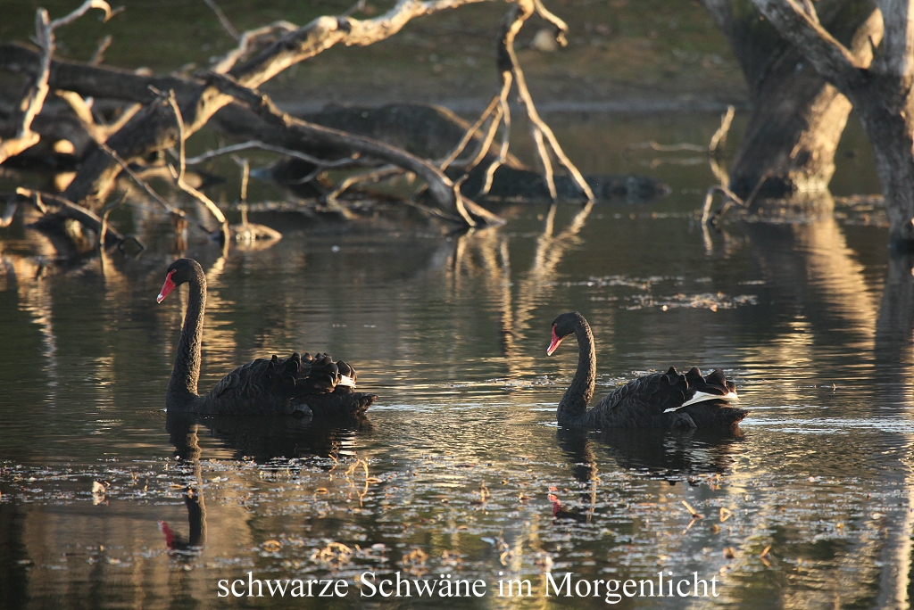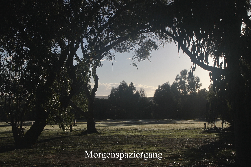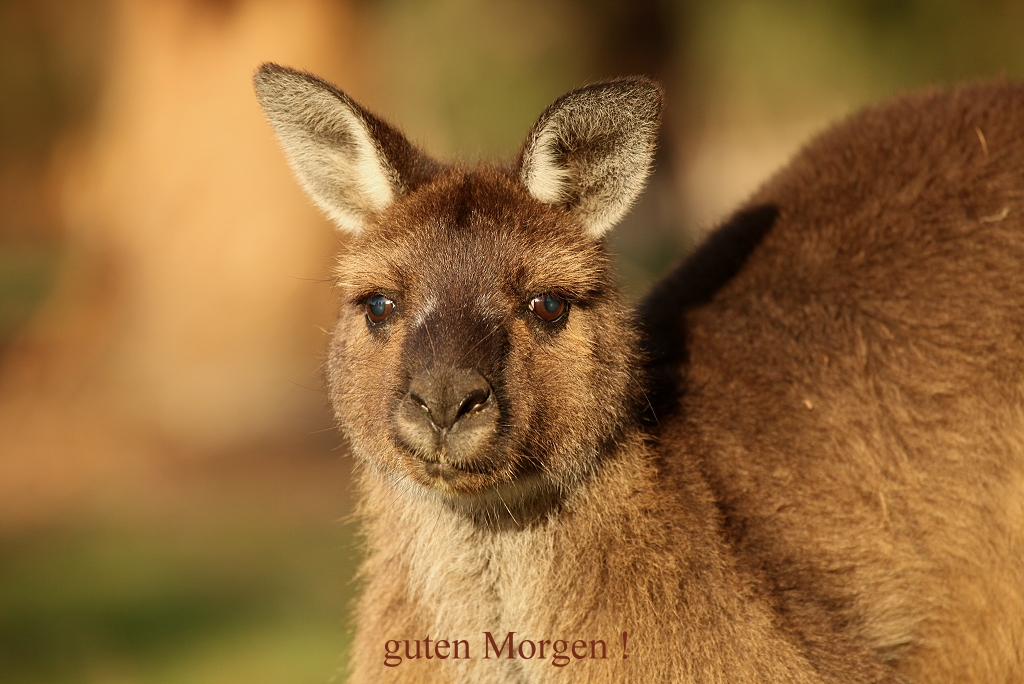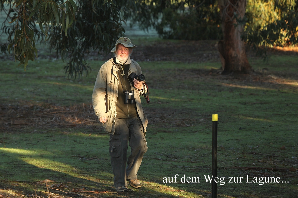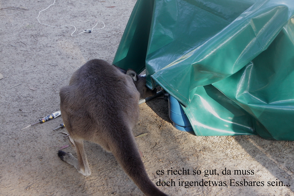 Zwei Kängurus badeten gemütlich in der Morgensonne und ließen sich von den Strahlen aufwärmen. Im Wasser der Lagune konnte man viele kleine Taucher beobachten, sowie drumherum Galahs, Gänse, Lapwings, Ibis, Enten und einen Kormoran, also die üblichen Vögel…. Um 8:30 Uhr beendeten wir unseren Morgenspaziergang und machten uns fertig für die Fahrt zur Murray-Lagune. Nachdem ich die Campingmöbel unter einer Plane gesichert hatte, kam unser "Haus-Känguru" vom Nachbar-Stellplatz herüber und begann unter der Plane zu schnüffeln. Da es dort nichts fressbares fand, ging es plötzlich auf Tomoko los. Es richtete sich auf und berührte Tomoko mit seinen Vorderbeinen. Als es aber nichts zu fressen gab, fing es auf einmal mit beiden Hinterbeinen an zu treten und zu boxen, allerdings nicht sehr heftig. |