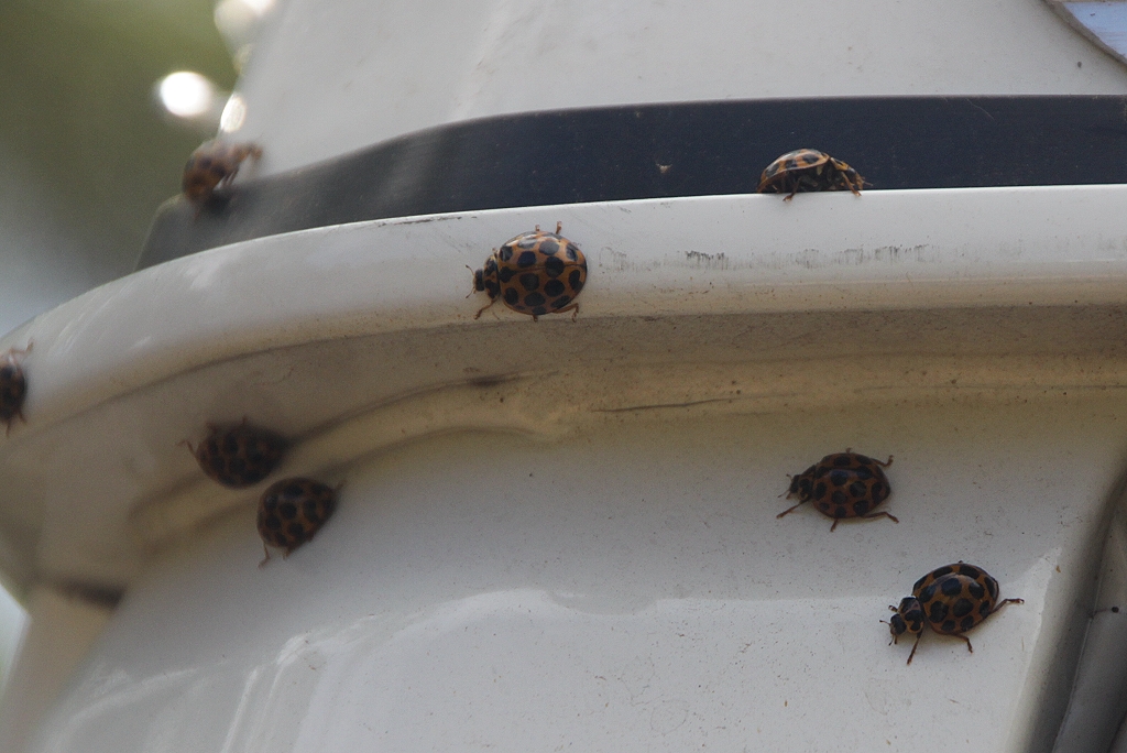 Tomoko hatte die Vision eines Horrorfilms mit dem Titel "Die Rache des Marienkäfers". Wir versuchten schnell ohne Marienkäfer ins Auto zu kommen, was natürlich nicht gelang. Alsbald krabbelten sie zahlreich auch innen auf den Scheiben. Wir fuhren ohne Wasser zu trinken los in der Hoffnung, dass der Fahrtwind die Käfer wohl wegwehen würde. Das klappte aber nicht ganz. Etliche Tiere blieben sitzen.