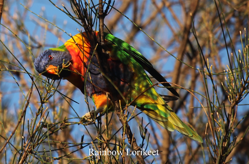 Also ging ich wieder zurück und gegen 16.00 Uhr fuhren wir wieder zum Campingplatz zurück. Wir schauten nach, ob der kleine Koala noch auf seinem Baum saß, was er noch tat. In dem Moment flogen einige schwarze Vögel über uns hinweg. Gleich erkannte Tomoko, dass es sich um Yellow-tailed Black Cockatoos handelte. Aber obwohl sie so schnell wie sie konnte losrannte, die Vögel waren schneller und verschwanden. Wenigstens konnte sie noch ein Wallaby und einen Rainbow Lorikeet im warmen Licht der Abendsonne fotografieren. |