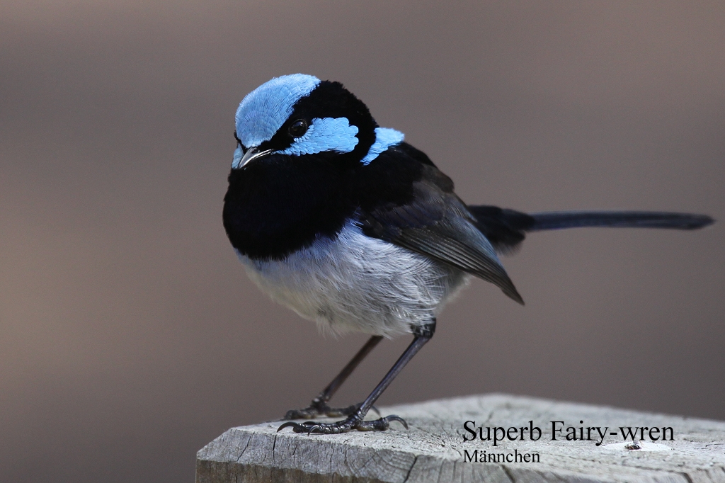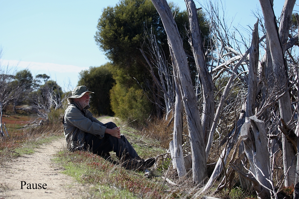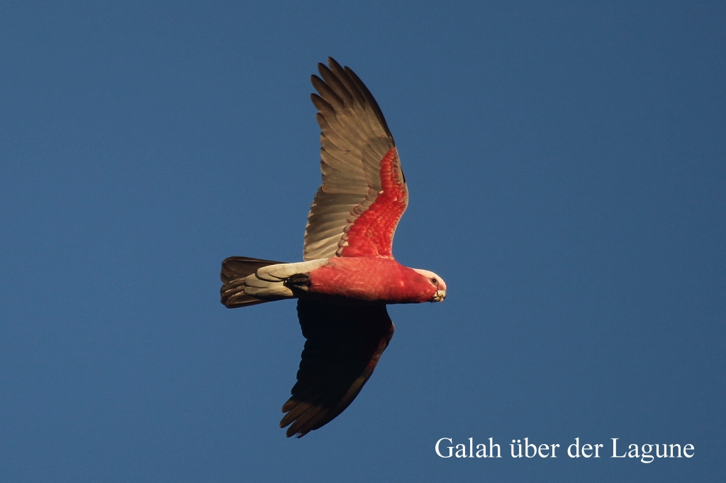 Zahlreiche trockene abgestorbene Bäume standen in einer schier endlosen Ebene, die durch einen dichten roten Pflanzenteppich einen starken Kontrast zum blauen Himmel bildete. Aus etwa 1 km Entfernung schimmerte das blaue Wasser der Lagune zu uns herüber. Auf einem trockenen Baum saß in einiger Distanz ein Adler. Wir wanderten den gesamten Trail entlang, konnten aber weiter, außer ein paar kleinen Fairy-wrens und Australian Magpies, keine anderen Vögel sehen. Auf dem Rückweg um 11.20 Uhr hüpften plötzlich 3 Kängurus unmittelbar vor meiner Nase aus den Büschen, sprangen über den Pfad und verschwanden wieder so schnell wie sie gekommen waren. Ich war ziemlich erschrocken. |