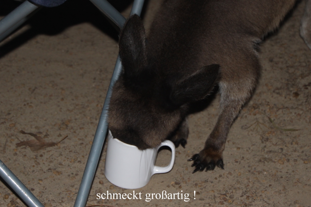 Alles wurde genüsslich verspeist, selbst ein Lorbeerblatt. Auch die Reste am Boden leckte es sorgfältig auf. Tomokos Suppenbecher stand noch auf dem Tisch. In diesen steckte das Känguru seine Nase, ging damit zum Boden und leckte noch eine ganze Weile mit seiner Zunge darin herum, eine wirklich lustige Szene… Ich streichelte sein weiches Fell, was ihm offenbar gefiel. Dann hoppelte es zufrieden zum Nachbar-Caravanplatz. Inzwischen sank die Abendsonne immer tiefer und die ersten Sterne kamen zum Vorschein. Der Wind flaute langsam ab. Gegen 18.00 Uhr war es dunkel. Ich spülte alles sorgfältig und duschte noch mal. Anschließend schrieb ich Tagebuch und Tomoko zeichnete wieder etwas, diesmal ein Känguru. So ließen wir den Tag gemütlich ausklingen und gingen gegen 21.30 Uhr schlafen. |