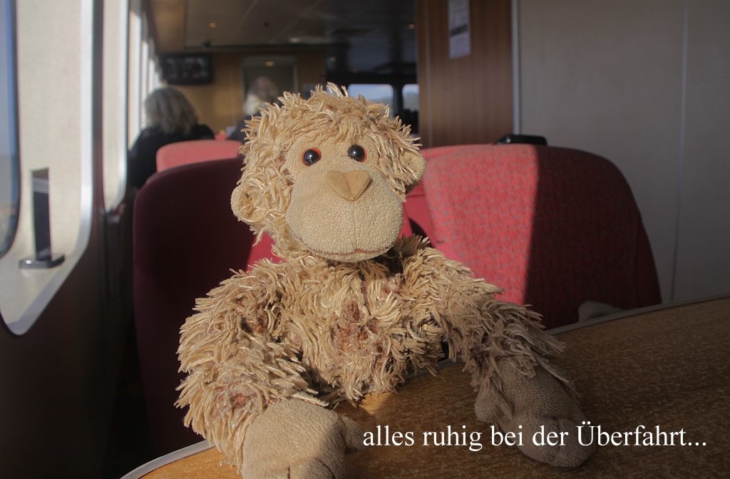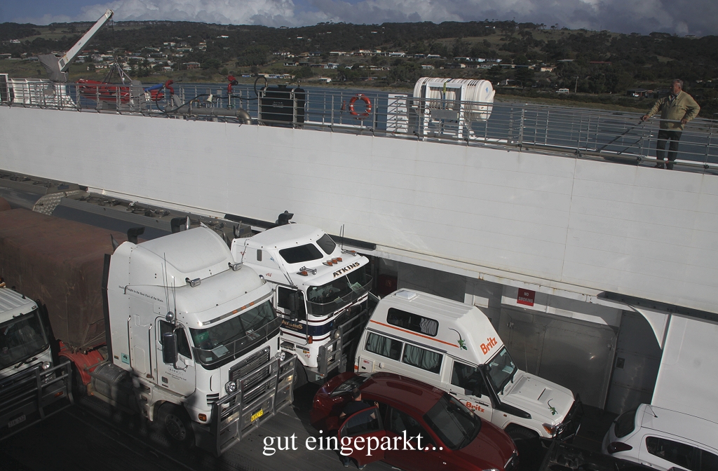 Pünktlich um 14.00 Uhr erreichten wir die Abfahrtsstelle der Fähre, die uns wieder aufs Festland bringen sollte. In einem nahen Supermarkt mussten wir Entelchen enttäuschen, es gab leider kein Bier zu kaufen, aber übermorgen in Adelaide, versprochen. Das Beladen der Fähre ging schleppend voran, da einige schwere Lastwagen mit langen Hängern rückwärts auf die Fähre rangieren mussten. Endlich war auch ich dran. Auch ich wieder rückwärts, was inzwischen tadellos klappte. |