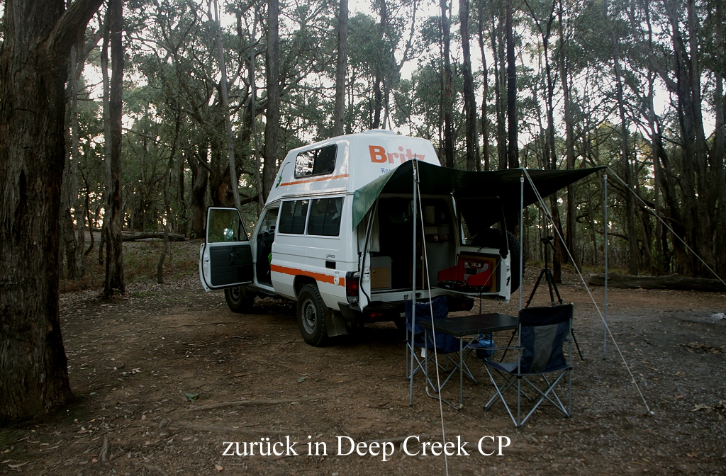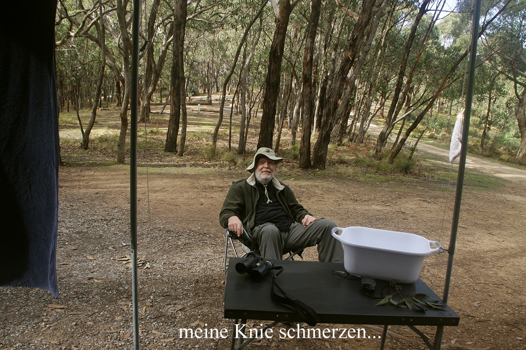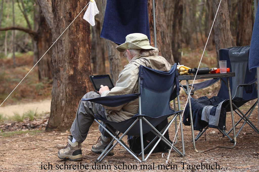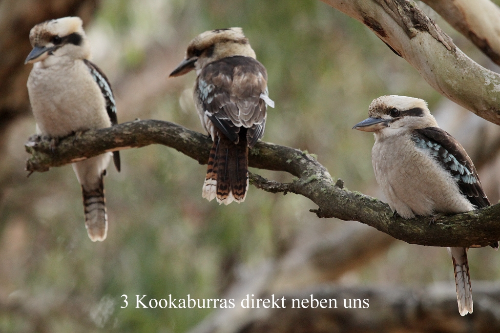Wir wanderten langsam unter den hohen Bäumen entlang und nach insgesamt 2 ½ Stunden und 4,5 km waren wir mit müden Beinen um 11.15 Uhr wieder zurück am Campingplatz, wo wir von einem am Boden sitzenden Kookaburra begrüßt wurden. Tomoko machte gleich mal Wasser heiß für Tee und Kaffee, was unsere Lebensgeister wieder weckte. Ich begann schon mal mit meinem Tagebuch. Währenddessen kamen weitere Kookaburras angeflogen, die sich wenig Scheu zeigend direkt neben uns niederließen. |