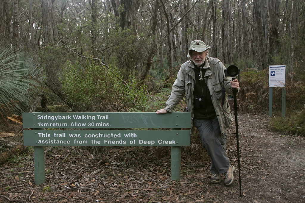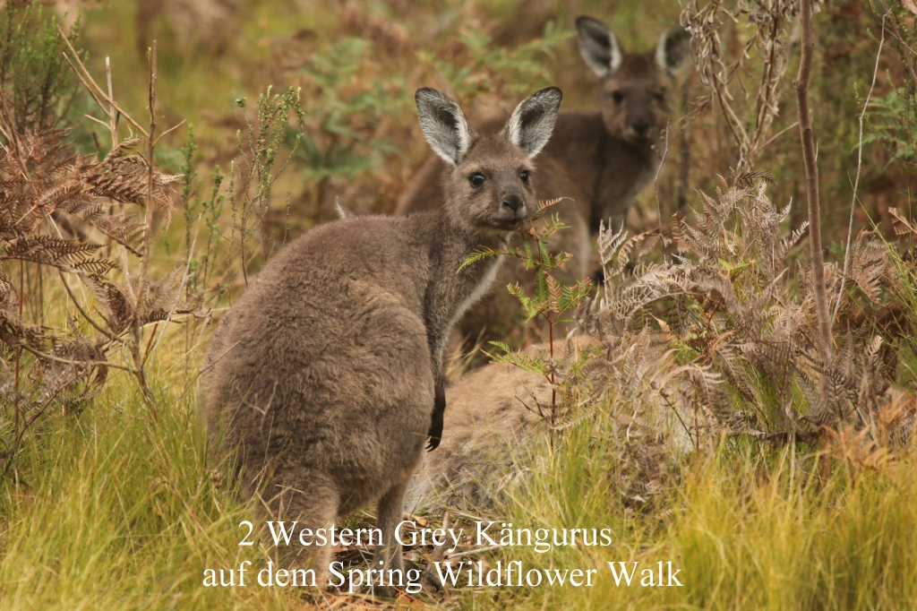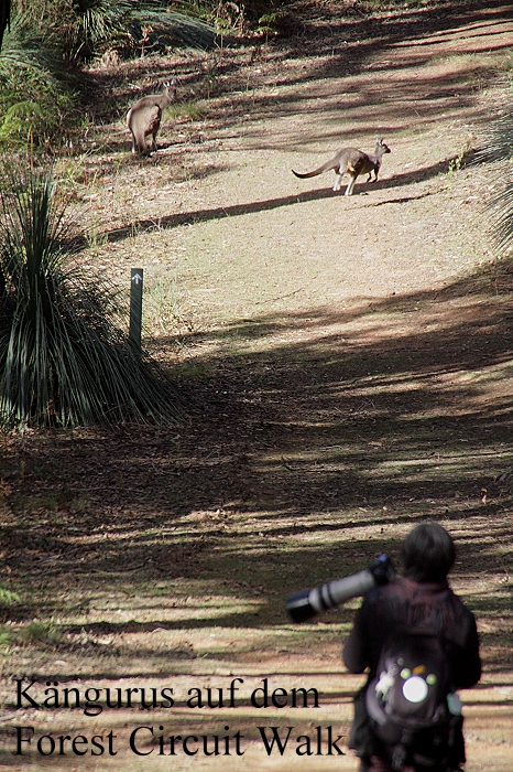 Das Wetter hatte erstaunlich gut gehalten, allerdings so richtig warm wurde es nicht, nur so um die 15°. Wir blieben eine Weile gemütlich sitzen, aßen Donut und Carrot Cake und ließen uns von der Sonne bescheinen. Um 13.45 Uhr hatten wir Lust auf einen weiteren Spaziergang. Diesmal gingen wir Richtung Westen, wo ein 2,5 km langer Rundweg abzweigte. Auch der schlängelte sich wieder durch alte Bäume, die aber deutlich lichter standen, so dass die doch recht kräftige Sonne uns ins Gesicht schien. Die Bäume hatten alle ziemlich verkohlte Stämme. Vor einigen Jahren muss hier wohl ein kräftiges Buschfeuer gewütet haben. Tomoko hatte ihren Hut vergessen und da sie auch noch Kopfweh hatte, ging sie recht schnell, so dass ich ihr kaum folgen konnte. Nach 1,25 km machte der Weg eine scharfe Rechtskurve und es ging wieder zurück, jetzt mit der Sonne im Rücken, was angenehmer war. 500 m voraus saßen 3 Kängurus auf dem Weg. Als wir uns bis auf etwa 200 m genähert hatten, sprangen sie in großen Sätzen davon. |