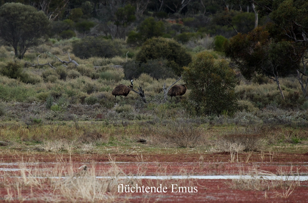 Es wurde immer windiger und wir machten uns wieder auf den Rückweg. Auf den hin und wieder auftauchenden kleinen Bänken nahmen wir immer für ein paar Minuten Platz, um die müden Beine etwas zu entlasten. Um 13.50 Uhr, nach etwas mehr als 6 km Fußmarsch, kamen wir wieder beim Visitor-Center an. Wir holten unseren aus der Bäckerei in Waikerie mitgebrachten Kuchen (Chocolate-Caramel-Schnitte) und Kaffee ( leider inzwischen kalt geworden) aus dem Auto und verzehrten beides mit großem Appetit zusammen mit unseren Bären an einem nahe stehenden Picknicktisch. Um 14.15 Uhr stiegen wir alle wieder ins Auto und fuhren den Track Nr.2 Richtung Westen bis zum Old Gluepot Dam. Nach kurzer Strecke hielten wir an, da Tomoko einen Hooded Robin gesehen hatte. Um 15.00 Uhr kamen wir am Old Gluepot an. In einer Entfernung von etwa 800 m entdeckte Tomoko 2 Emus, die ziemlich eilig am Rande eines kleinen Sees entlangliefen und nach einiger Zeit in den Büschen wieder verschwanden. Da in dem Hide in der Nähe weder was zu sehen noch zu hören war, fuhren wir weiter Richtung "Bellbird" Campingplatz. Nach ein paar km entdeckten wir 3 Mulga Parrots, ziemlich gut sichtbar in einem Baum sitzend.