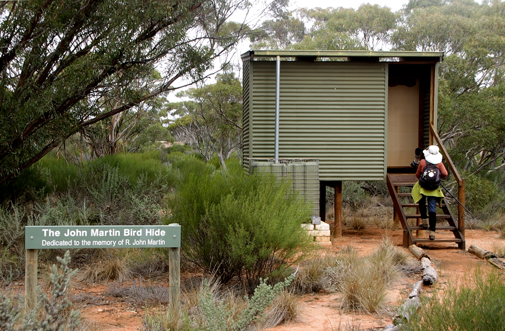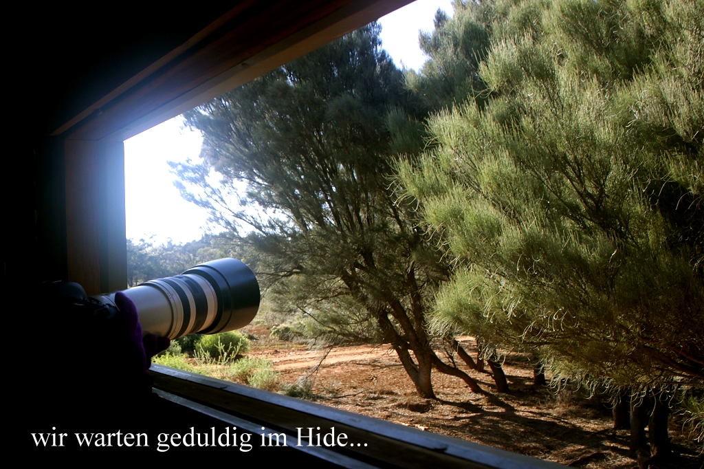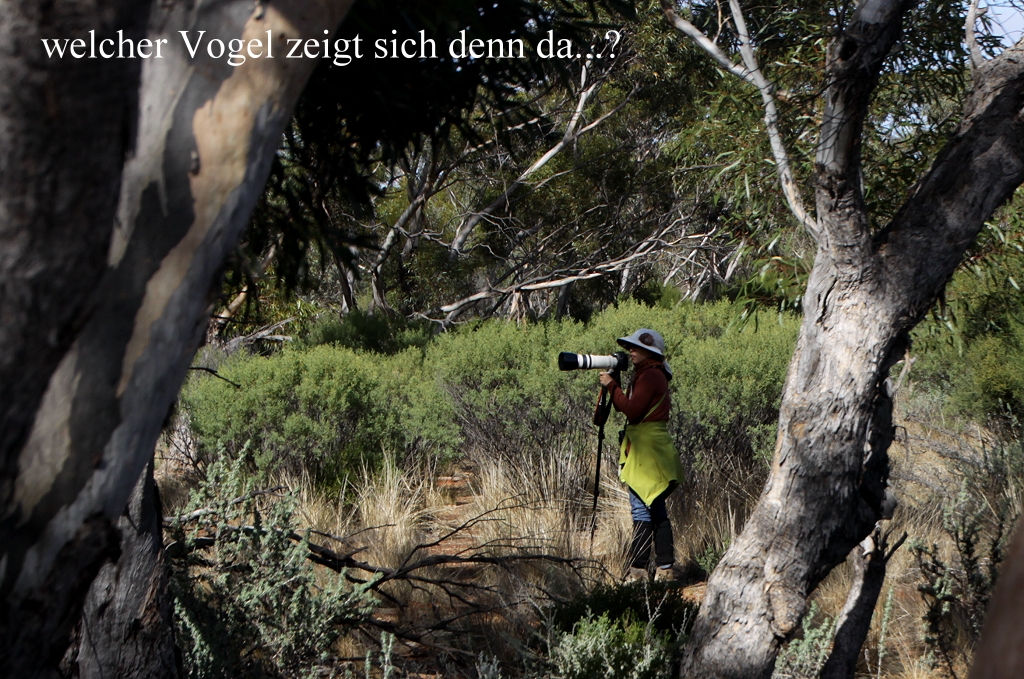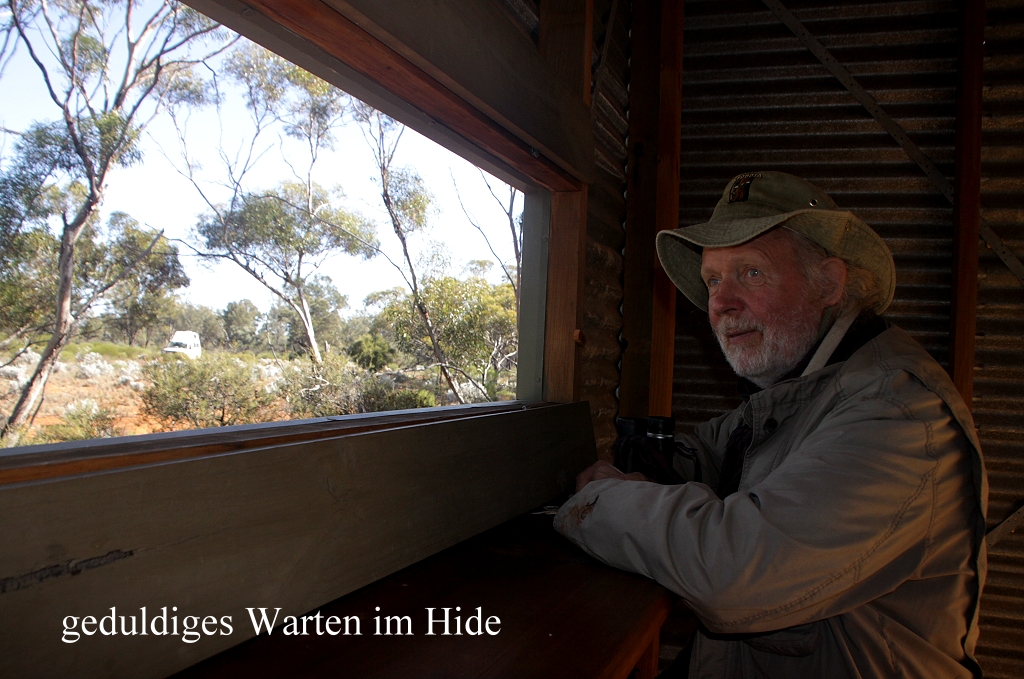 Leider sahen wir keinen Grasswren, der dem Trail seinen Namen gibt. Auch ein paar Ziegen streiften durch die Büsche. Um kurz vor 11.00 Uhr frischte der Wind wieder auf. Da die sandige Landschaft mit ihrer buschigen Eukalyptusvegetation immer gleich blieb, zogen wir es vor, den gleichen Weg wieder zurückzugehen, so dass wir anstelle von 6 km nur 3,4 km laufen mussten. Somit kamen wir um 12.10 Uhr wieder zum Ausgangspunkt zurück. In etwa 800 m Entfernung konnten wir wieder eine Gruppe Emus beobachten, so 7-8 Tiere, die langsam immer am Boden pickend durch die Landschaft zogen. Nun war es Zeit für unsere Kaffeepause mit Kuchen. Heute gab es Peacan Tarte, die wir in der Bäckerei in Waikerie gekauft hatten. Schmeckte wunderbar, meinten auch die Bären… Um 12.45 Uhr beendeten wir die Kaffeepause und fuhren nochmals zum nahegelegenen Hide zurück. Auf dem Weg dorthin sahen wir 2 Mulga Parrots und verschiedene andere Vögel.