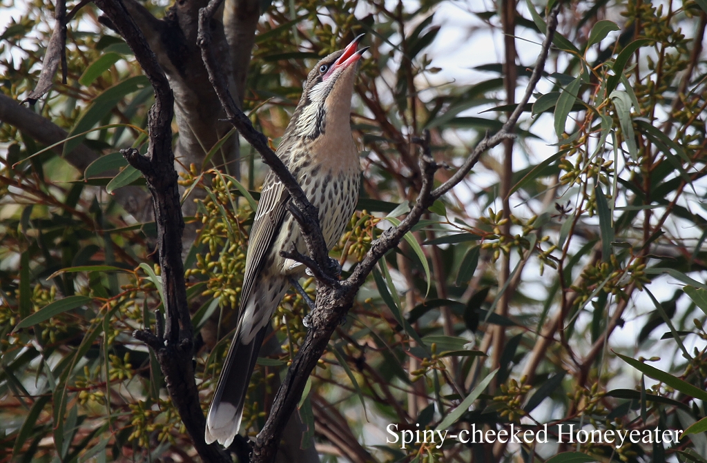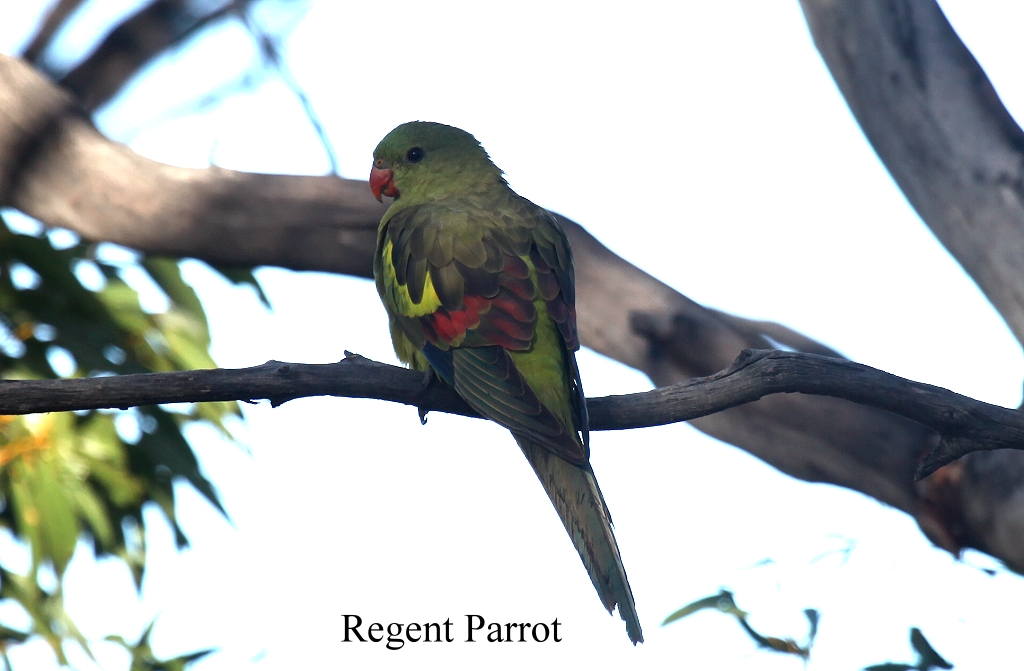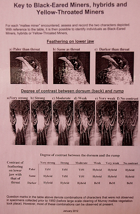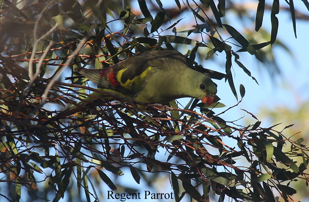 Um 8.35 Uhr kamen wir schon beim Hide-Parkplatz an. Vorsichtig gingen wir die kurze Strecke bis zum Hide und ließen uns, ohne Geräusche zu verursachen, auf einer Bank im Inneren nieder. Zwei wunderschöne Papageien (Regent Parrot) saßen in einem Baum etwa 10 m entfernt. Einer saß ziemlich ruhig auf seinem Ast, während der andere in den Zweigen herumkletterte und offensichtlich nach Früchten suchte. Vorher hatte Tomoko, die einen Augenblick früher gekommen war, einen Butcherbird gesehen. Während ich die Papageien filmte, tauchte plötzlich ein großer Schwarm (so um die 20) Miners auf. Einige waren mit Sicherheit Yellow-throated Miner, da diese sich aber auch mit Black-eared Miner paaren und es dadurch zu Hybridbildung (Mischformen) kommt, waren wir bei den anderen nicht sicher.