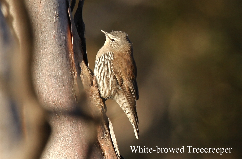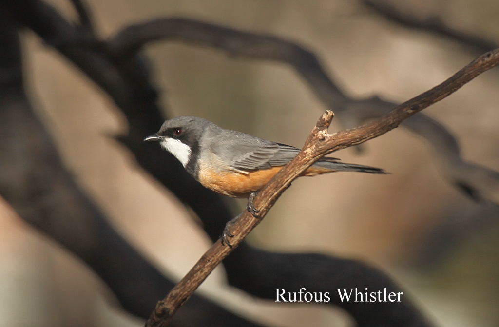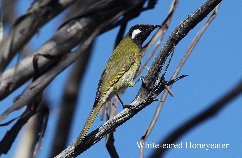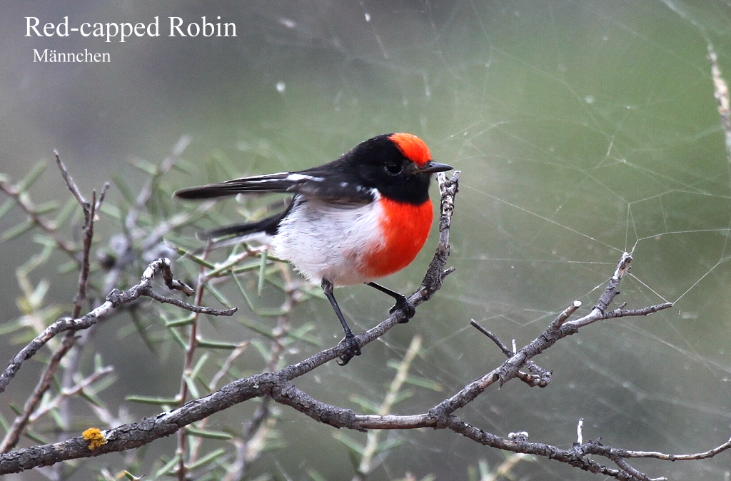 Nun marschierten wir los. Der Himmel bewölkte sich zusehends wieder. Hoffentlich zieht es nicht ganz zu so wie gestern … Dieser Trail ist eigentlich ein Rundweg. Wir gingen in etwa 1,7 km entlang. Am Ende blieben wir eine halbe Stunde auf einer Bank sitzen und beobachteten etliche Vögel, unter anderem einen White-fronted Honeyeater, ein Pärchen Red-capped Robin, Spiny-cheeked Honeyeater, Yellow-plumed Honeyeater, White-eared Honeyeater, Gilbert's Whistler.