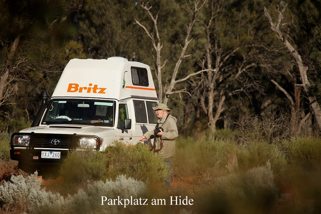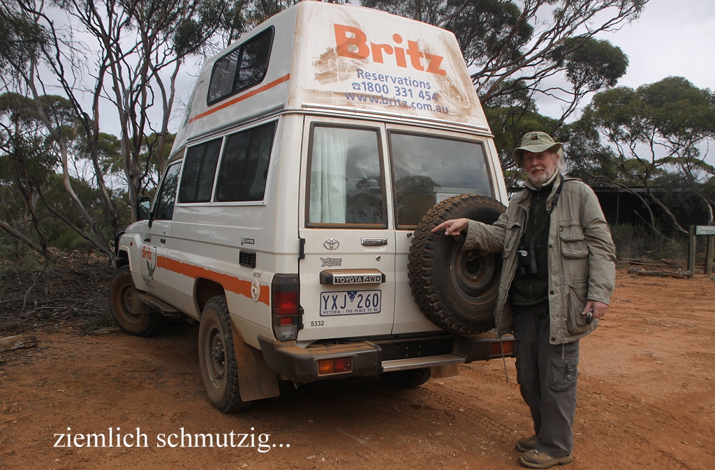 Wieder einige km weiter kreuzte ein kleiner Schwarm Babbler unseren Weg, ein Vogel, der von Birdwatchern immer wieder hier gesucht wird. Um 16.30 Uhr waren wir wieder zurück bei unserem Campingplatz. Wir waren immer noch die einzigen Gäste. Unser Auto war durch den roten staubigen Sand ziemlich schmutzig geworden.