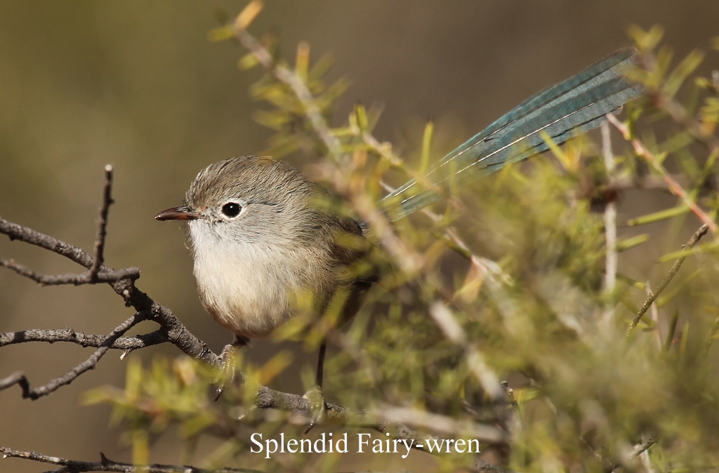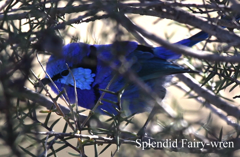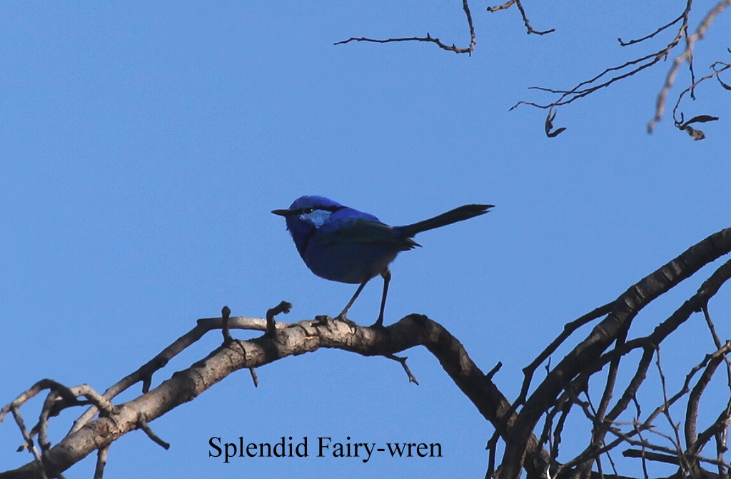 Am Hide selbst war es ganz still, nichts zu sehen, so dass wir nach 10 Minuten wieder wegfuhren und zwar nach Süden etwa 12 km zum Long Dam, den wir gegen 14.00 Uhr erreichten. Hier ließen wir das Auto stehen und gingen langsam etwa 500 m zu Fuß. Inzwischen war der Himmel wieder wolkenlos, nur der Wind war immer noch stark. Da mein Bart mich leider nicht genügend vor dem kalten Wind schützte, gab mir Tomoko ihren zweiten Schal. Wir sahen und hörten etliche Spiny-cheeked Honeyeater und in einiger Entfernung einen kleinen Southern Whiteface. Eine Gruppe Ziegen kam auf uns zu, lief aber schnell wieder zur Seite weg. Auf dem Rückweg gegen die schon recht tiefstehende Sonne tauchte auf dem Weg eine Gruppe Splendid Fairy-wren auf. Zu unserer großen Freude war auch ein Männchen im leuchted blauen Prachtkleid darunter.