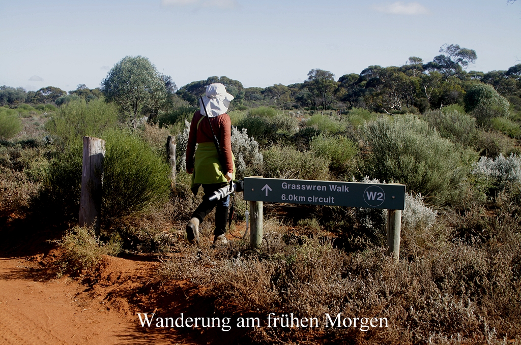 Gegen 9.40 Uhr wurde uns ein wenig kalt im Hide. Wir gingen zum Auto zurück und fuhren ein kleines Stück zurück, wo der Grasswren Trail abzweigte. Hier kamen wir um 9.50 Uhr an. Als wir ausstiegen, sah ich in etwa 500 m Entfernung, wie sich ein langer Hals mit Schnabel durch das niedrige Buschwerk bewegte. Beim näheren hinsehen erkannte ich, dass dort ein Emu herumspazierte, leider zu weit für ein Foto.
