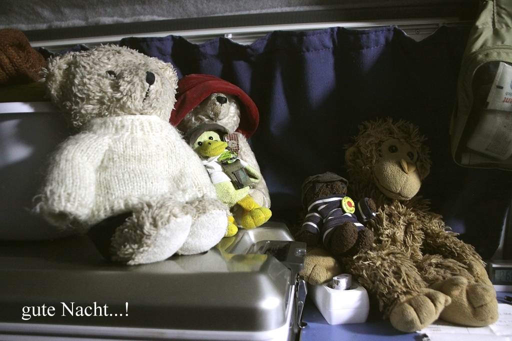 Ich befestigte wie immer die Markise am Auto und Tomoko begann mit den Vorbereitungen fürs Abendessen. Heute verlängerte sie nur unsere Suppe von gestern mit etwas zusätzlichem Gemüse. Ich trank mit Entelchen ein Bier, das uns nach der anstrengenden Wanderung besonders gut schmeckte. Auch die darauf folgende Suppe tat sehr gut. Im späten Nachmittagslicht sanken die Temperaturen ziemlich schnell wieder ab. Deshalb zogen wir uns nach dem Essen sehr bald ins noch warme Auto zurück. Tomoko legte sich mit einer kleinen Wärmeflasche faul auf die Innenbank und studierte ihr Vogelbuch. Ich schrieb derweil wieder Tagebuch, womit ich gegen 19.30 Uhr fertig war. Draußen war es ganz still. Wir blieben einfach im noch warmen Inneren des Autos und begannen schon mal mit dem Bettenbau. Früh gingen wir ins Bett, tauschten aber heute mal die Seiten, d.h. ich musste an die kalte Außenwand. Mal sehen wie ich das überstehe…